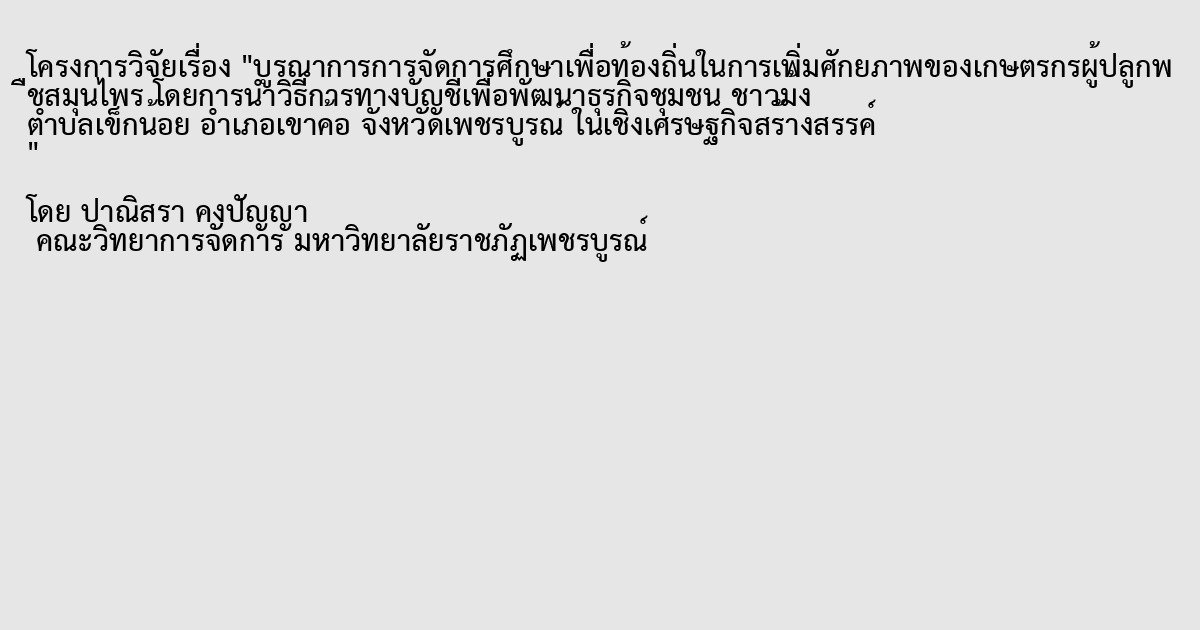 งานวิจัยนี้เป็นการวิจัยเชิงปฎิบัติการแบบมีส่วนร่วมเพื่อบูรณาการการจัดการศึกษาเพื่อท้องถิ่นในการเพิ่มศักยภาพของเกษตรกรผู้ปลูกพืชสมุนไพร โดยการนำวิธีการทางบัญชีเพื่อพัฒนาธุรกิจชุมชน ชาวม้ง ตำบลเข็กน้อย อำเภอเขาค้อ จังหวัดเพชรบูรณ์ โดยมีวัตถุประสงค์ 1) เพื่อให้เกษตรกรผู้ปลูกพืชสมุนไพรกลุ่มชาติพันธุ์ชาวม้งได้เรียนรู้และพัฒนาความรู้ทางบัญชีร่วมกัน โดยสามารถนำไปสู่การปฏิบัติได้จริง 2) เพื่อให้กลุ่มชาติพันธุ์ชาวม้งตระหนักถึงความสำคัญและประโยชน์ของวิธีการทางบัญชี และสามารถนำไปใช้เป็นส่วนหนึ่งของการดำเนินชีวิตประจำวัน กลุ่มตัวอย่าง ได้แก่ กลุ่มเกษตรกรที่ปลูกพืชสมุนไพรชาวม้ง 30 คน ที่ร่วมกันสนทนากลุ่ม เครื่องมือที่ใช้ในการวิจัยเป็นแบบสนทนากลุ่มโดยการจดบันทึกและรูปแบบที่เหมาะสมในการทำบัญชีที่สร้างขึ้น การวิเคราะห์ข้อมูลโดยการสรุปจากการสนทนา การทดสอบการทำบัญชีที่เหมาะสมที่สร้างขึ้น ผลการวิจัยพบว่า 1) เกษตรกรที่ปลูกพืชสมุนไพรขาดความรู้และการอ่านภาษาไทย จึงทำให้การอบรมวิธีการทางบัญชีในเรื่องต่างๆ นั้นไม่ค่อยเข้าใจ 2) หลังการสนทนากลุ่มแล้วมีการเรียนรู้และพัฒนาความรู้จากการอบรมวิธีการทางบัญชี แล้วมาร่วมกันคิดและสร้างรูปแบบการทำบัญชีที่เหมาะสมให้กับชาวม้งได้ 2 รูปแบบ 3) ทำการทดสอบการทำบัญชีที่สร้างขึ้นทั้ง 2 รูปแบบ แล้วพบว่ากลุ่มเกษตรกรสามารถมีความรู้ความเข้าใจ สามารถทำแบบทดสอบได้ทุกคน แสดงว่ากลุ่มเกษตรกรเห็นถึงความสำคัญและมีความสนใจที่จะเรียนรู้วิธีทำบัญชีที่สามารถนำไปใช้เป็นส่วนหนึ่งของการดำเนินชีวิตประจำวันได้ในการทำธุรกิจ