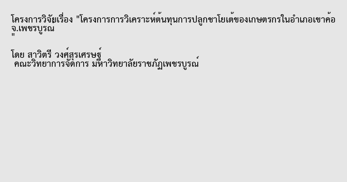การวิจัยครั้งนี้ มีวัตถุประสงค์เพื่อศึกษาสภาพทั่วไปของการปลูกชาโยเต้ของเกษตรกร และเพื่อวิเคราะห์ต้นทุนการปลูกชาโยเต้ของเกษตรกร โดยเก็บข้อมูลจากการใช้แบบสอบถาม และการสัมภาษณ์กลุ่มเกษตรกรผู้ปลูกชาโยเต้ อำเภอเขาค้อ จังหวัดเพชรบูรณ์ จำนวน 37 คน จากการรวบรวมข้อมูล หนังสือ งานวิจัยที่เกี่ยวข้อง โดยนำข้อมูลที่ได้มาทำการวิเคราะห์โดยใช้ค่าเฉลี่ย และร้อยละ พบว่า กลุ่มเกษตรกรผู้ปลูกชาโยเต้ส่วนใหญ่เคยปลูกชาโยเต้มาแล้วมากกว่า 2 ปี ปัญหาและอุปสรรคที่พบ คือ เรื่องโรคและแมลง และต้องการการสนับสนุนส่งเสริมจากรัฐบาลในเรื่องการหาแหล่งความรู้และเทคนิคต่าง ๆ เกี่ยวกับการปลูกชาโยเต้