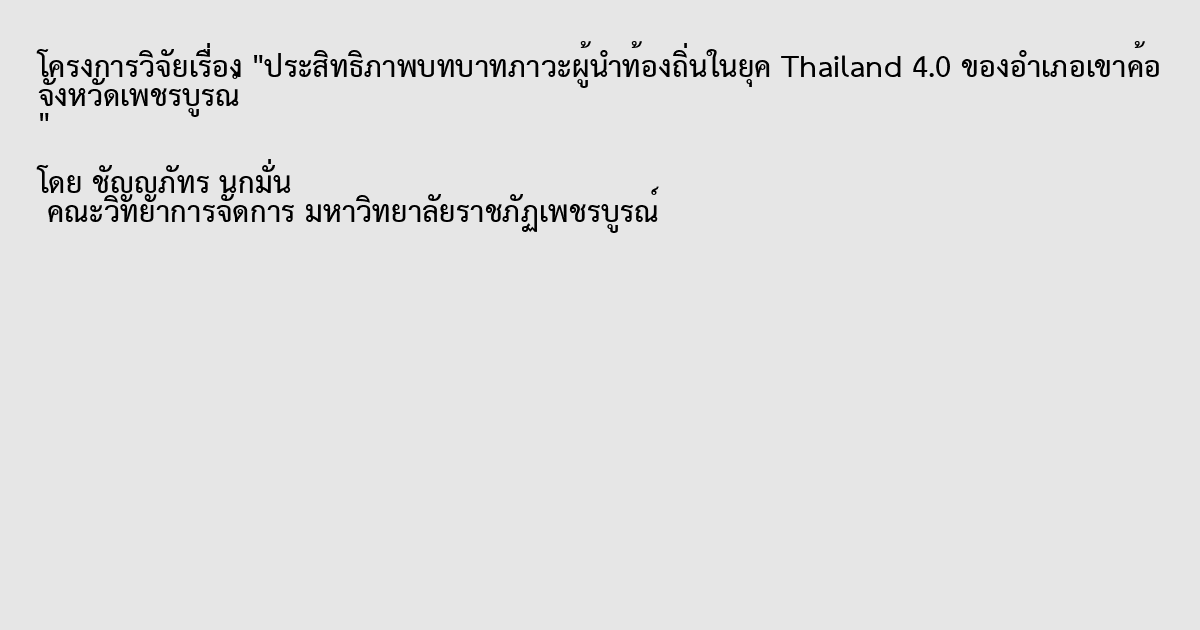 การวิจัยเรื่องประสิทธิภาพบทบาทภาวะผู้นำท้องถิ่นในยุค Thailand 4.0 อำเภอเขาค้อ จังหวัดเพชรบูรณ์ ซึ่งมีวัตถุประสงค์เพื่อศึกษาปัจจัยที่ส่งเสริมให้ผู้นำมีบทบาทคุณลักษณะของผู้นำที่ประสบความสำเร็จในยุค 4.0 และเพื่อให้ผู้นำท้องถิ่นได้นำองค์ความรู้ไปถ่ายทอดในองค์กรได้อย่างมีประสิทธิภาพและทันต่อการเปลี่ยนแปลง เป็นการศึกษาเชิงปริมาณ (Qualitative Research) ผู้วิจัยเก็บข้อมูลจากกลุ่มตัวอย่างซึ่งเป็นบุคลากรที่มีตำแหน่งเป็นผู้นำท้องถิ่นของอำเภอเขาค้อ จังหวัดเพชรบูรณ์ จากองค์กรปกครองส่วนท้องถิ่น 5 แห่ง ได้แก่ เทศบาลตำบลแคมป์สน ครอบคลุมพื้นที่ตำบลแคมป์สนทั้งตำบล องค์การบริหารส่วนตำบลทุ่งสมอ ครอบคลุมพื้นที่ตำบลทุ่งสมอทั้งตำบล องค์การบริหารส่วนตำบลเขาค้อ ครอบคลุมพื้นที่ตำบลเขาค้อ ตำบลริมสีม่วง และตำบลสะเดาะพงทั้งตำบล องค์การบริหารส่วนตำบลหนองแม่นา ครอบคลุมพื้นที่ตำบลหนองแม่นาทั้งตำบล และองค์การบริหารส่วนตำบลเข็กน้อย ครอบคลุมพื้นที่ตำบลเข็กน้อยทั้งตำบลอำเภอเขาค้อแบ่งเขตการปกครองย่อยออกเป็น 7 ตำบล 72 หมู่บ้าน ได้แก่ ตำบลเขาค้อ มีจำนวน 14 หมู่บ้าน ตำบลแคมป์สน มีจำนวน 14 หมู่บ้าน ตำบลทุ่งสมอ มีจำนวน 14 หมู่บ้าน ตำบลริมสีม่วง มีจำนวน 6 หมู่บ้าน ตำบลสะเดาะพง มีจำนวน 5 หมู่บ้าน ตำบลหนองแม่นา มีจำนวน 10 หมู่บ้าน และตำบลเข็กน้อย มีจำนวน 12 หมู่บ้าน จำนวนทั้งสิ้น 100 คน