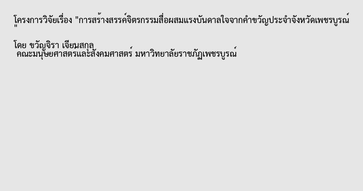 ซึ่งจากคำขวัญประจำจังหวัดเพชรบูรณ์นั้น ทางผู้วิจัยได้สร้างสรรค์ผลงานที่สื่อความหมายของคำขวัญผ่านผลงานจิตรกรรมสื่อผสม ที่สะท้อนคุณค่าที่เป็นเอกลักษณ์ของจังหวัดเพชรบูรณ์ ทั้งหมด 11 ภาพ ได้แก่ เมืองมะขามหวาน, อุทยานน้ำหนาว, ศรีเทพเมืองเก่า, เขาค้ออนุสรณ์ ,นครพ่อขุนผาเมือง และเมืองเพชรบูรณ์