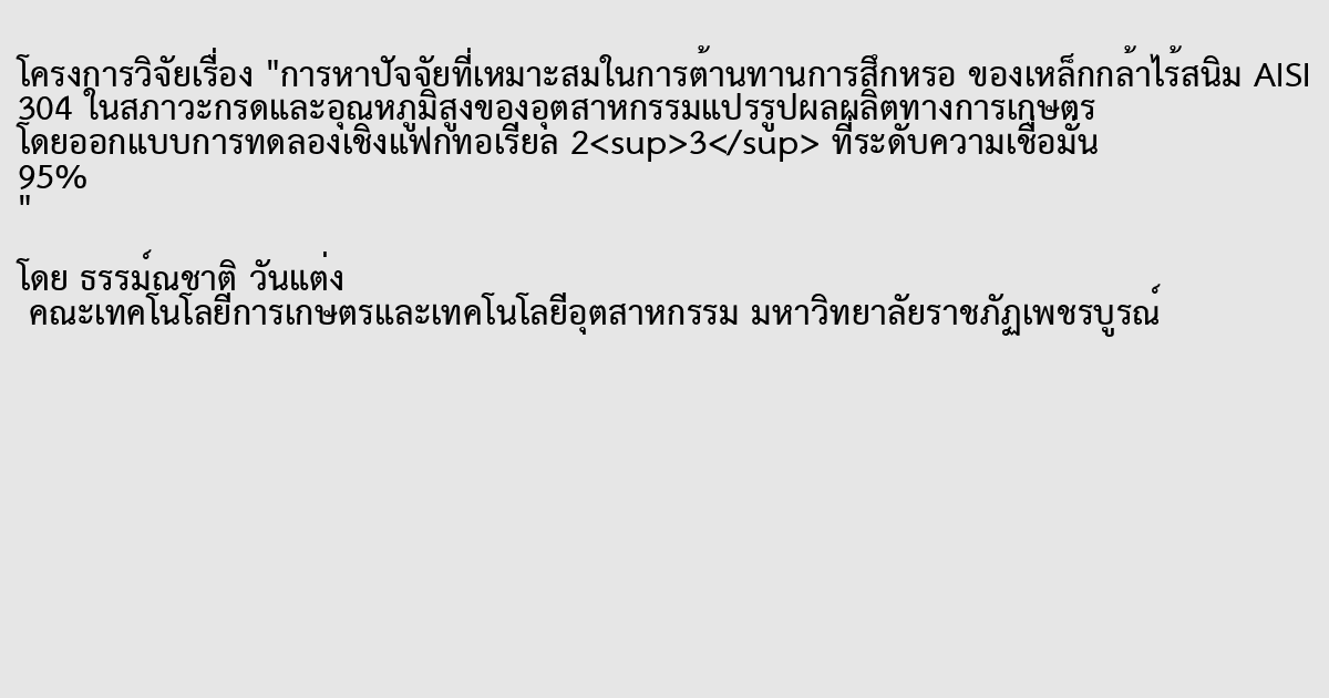 การหาปัจจัยที่เหมาะสมในการต้านทานการสึกหรอ ของเหล็กกล้าไร้สนิม AISI 304 ในสภาวะกรดและอุณหภูมิสูงของอุตสาหกรรมแปรรูปผลผลิตทางการเกษตร โดยออกแบบการทดลองเชิงแฟกทอเรียล 23 ที่ระดับความเชื่อมั่น 95%