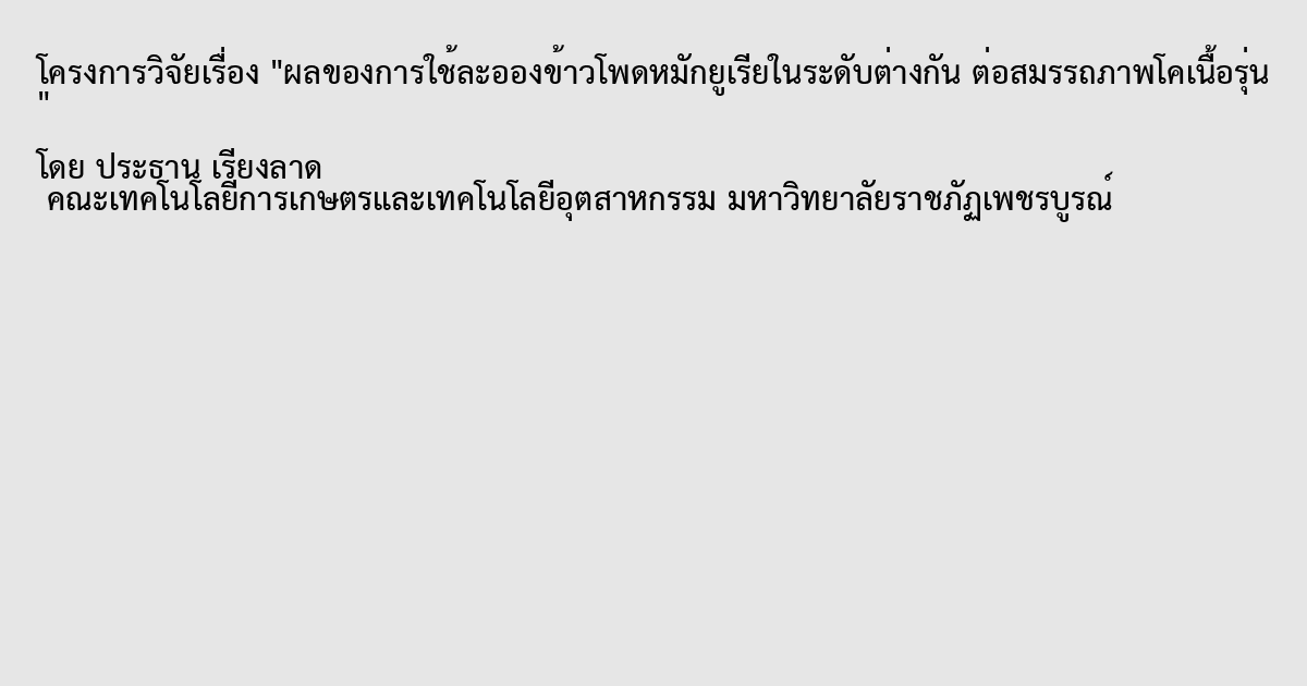 พบว่าโคเนื้อที่ได้รับอาหารละอองข้าวโพดหมักยูเรียที่แตกต่างกัน 4 ระดับ โคเนื้อมีน้ำหนักตัวเพิ่มขึ้นตลอดระยะเวลาการทดลองเฉลี่ยน้ำหนักตัวสูงสุด (T1) มีค่าเท่ากับ 54.22 กิโลกรัม/ตัว ต่ำสุด (T4) มีค่าเท่ากับ 37.72 กิโลกรัม/ตัว อัตราการเจริญเติบโตเฉลี่ยของโคเนื้อใกล้เคียงกัน มีค่าอยู่ระหว่าง 0.31 – 0.44 กิโลกรัม/ตัว/วัน ค่าพีเอช (pH) ในกระเพาะหมักมีค่าเฉลี่ย pH มีค่าอยู่ระหว่าง 6.78 - 6.87 ค่าความเข้มข้นของ NH3-N ในของเหลวจากกระเพาะหมัก มีค่าเฉลี่ยอยู่ระหว่าง 5.46 - 5.58 มิลลิกรัมเปอร์เซ็นต์ ค่า TVFAs ในของเหลวจากกระเพาะหมัก มีค่าเฉลี่ยอยู่ระหว่าง 93.82 - 97.74 มิลลิโมลาร์ ความเข้มข้นของกลูโคสในกระแสเลือด (blood glucose, BG) มีค่าเฉลี่ยอยู่ระหว่าง 11.65 – 11.77 มิลลิกรัมเปอร์เซ็นต์ และค่าความเข้มข้นของยูเรียในกระแสเลือด (blood urea nitrogen, BUN) มีค่าเฉลี่ยอยู่ระหว่าง 76.54 – 78.96 มิลลิกรัมเปอร์เซ็นต์
