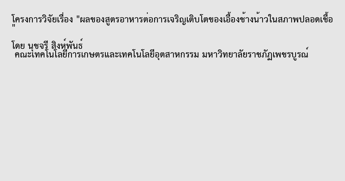 ผลของสูตรอาหารและสารควบคุมการเจริญเติบโตพืชต่อการเจริญเติบโตของเอื้องช้างน้าวในสภาพปลอดเชื้อ เพาะเลี้ยงเป็นระยะเวลา 84 วัน หลังจากเมล็ดงอก วางแผนการทดลองแบบสุ่มสมบูรณ์ (Completely Randomized Design, CRD) จากผลการทดลองพบว่า ต้นอ่อนเอื้องช้างน้าวเพาะเลี้ยงบนอาหารแข็งทั้ง 5 สูตรให้เปอร์เซ็นต์การเกิดยอด จำนวนยอด จำนวนใบ และความสูงต้นไม่แตกต่างกันอย่างมีนัยสำคัญทางสถิติ (p>0.05) ในขณะที่การเพาะเลี้ยงเอื้องช้างน้าวบนอาหารแข็งสูตร VW ที่เติมสารควบคุมการเจริญเติบโต BA ความเข้มข้น 2.0มิลลิกรัมต่อลิตร ซึ่งให้เปอร์เซ็นต์การเกิดยอดและจำนวนยอดสูงสุด ส่วนอาหารแข็งสูตร VW ที่เติม Kinetin ความเข้มข้น 0.5 มิลลิกรัมต่อลิตร ให้ความสูงต้น จำนวนราก และเปอร์เซ็นต์การเกิดรากสูงสุด จากนั้นศึกษาผลของสารควบคุมการเจริญเติบโต NAA ต่อการชักนำการเกิดราก พบว่า ต้นอ่อนเอื้องช้างน้าวเมื่อเพาะเลี้ยงบนอาหารแข็งสูตร VW ที่เติม NAA ความเข้มข้น 1.5 มิลลิกรัมต่อลิตร มีจำนวนรากและเปอร์เซ็นต์การเกิดรากสูงสุด