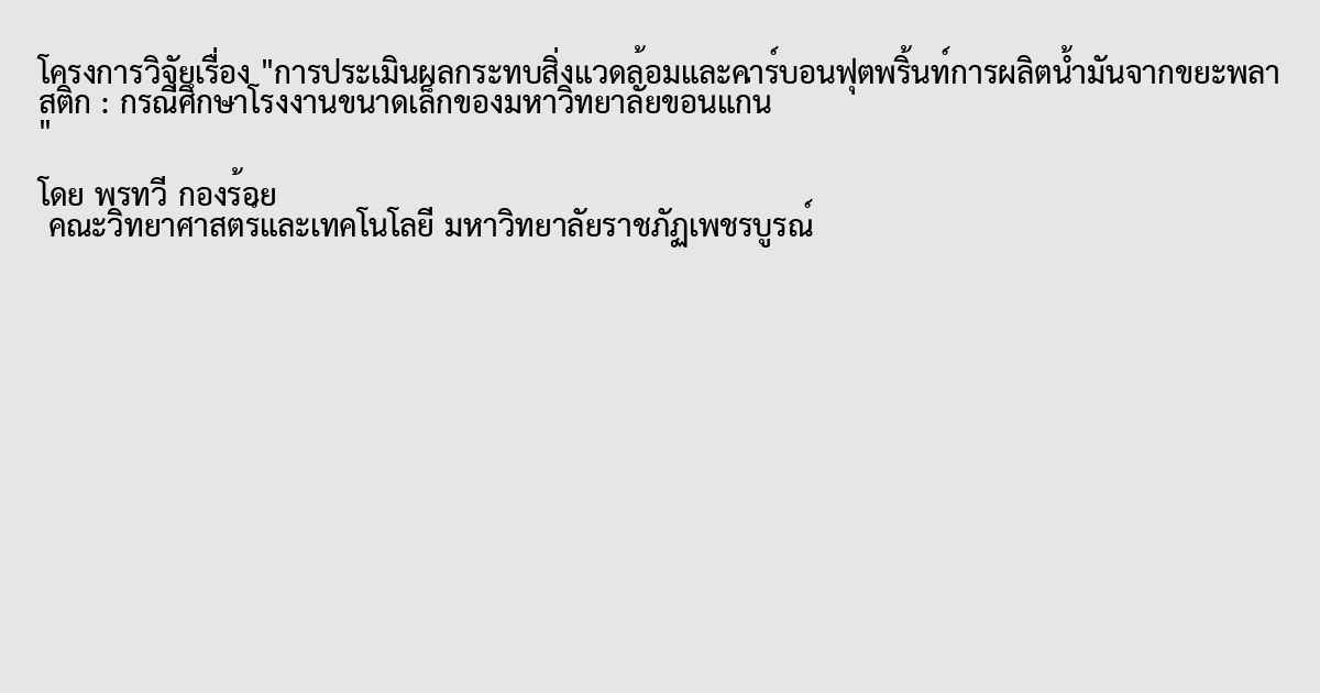 การศึกษาวิจัยเรื่อง “การศึกษาการประเมินผลกระทบสิ่งแวดล้อมและคาร์บอนฟุตพริ้นท์การผลิตน้ำมันจากขยะพลาสติก : กรณีศึกษาโรงงานต้นแบบขนาดเล็ก” มีวัตถุประสงค์ คือ เพื่อศึกษาปริมาณการปล่อยก๊าซเรือนกระจกของโรงงาน และ เพื่อประเมินคาร์บอนฟุตพริ้นท์ในโรงงาน โดยการศึกษาวิจัยเรื่อง “การประเมินคาร์บอนฟุตพริ้นท์ของโรงงาน” มีผลการวิจัยดังที่สรุปผลการวิจัยมาในข้างต้นพบว่า มลพิษที่เกิดขึ้นจากโรงงานผลิตน้ำมันจากขยะพลาสติก ประกอบด้วย ฝุ่นละออง น้ำเสีย ขี้เถ้า เสียง สำหรับกิจกรรมแต่ล่ะประเภทที่ปลดปล่อยก๊าซเรือนกระจก มีค่าเฉลี่ยของปริมาณการปล่อยก๊าซเรือนกระจก โดยปริมาณการปล่อยก๊าซเรือนกระจกแต่ล่ะประเภทจากการเก็บข้อมูลในโรงงานฯ ซึ่งการศึกษาในครั้งนี้ได้นำข้อมูล ยาพาหนะ พลังงานไฟฟ้า การใช้เชื้อเพลิง มาทำการวิเคราะห์ข้อมูล พบว่า พบว่าการใช้พลังงานทั้งหมดในโรงงาน โดยเฉลี่ยภายใน 1 ปี มีปริมาณการใช้เชื้อเพลิงมีการปลดปล่อยก๊าซเรือนกระจกมากที่สุด คือ 844,975 kgCO2eq/year รองลงมาคือการใช้ยานพาหนะและไฟฟ้า ที่ปริมาณ 12,873และ 152 kgCO2eq/year ตามลำดับ