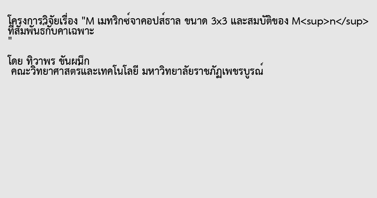 \({\rm{M}}\,\,{\rm{ = }}\)\(\left[ {\begin{array}{*{20}{r}}{\rm{1}}&{\rm{2}}&{\rm{0}}\\{\rm{1}}&{\rm{0}}&{\rm{1}}\\{\rm{0}}&{\rm{0}}&{\rm{1}}\end{array}} \right]\) ซึ่งมีค่าเฉพาะ \({\delta _1}\,\,\, = \,\,\,1\), \({\delta _2}\,\,\, = \,\,\, - 1\), \({\delta _3}\,\,\, = \,\,\,2\) สัมพันธ์กับจำนวนจาคอปส์ธาล
