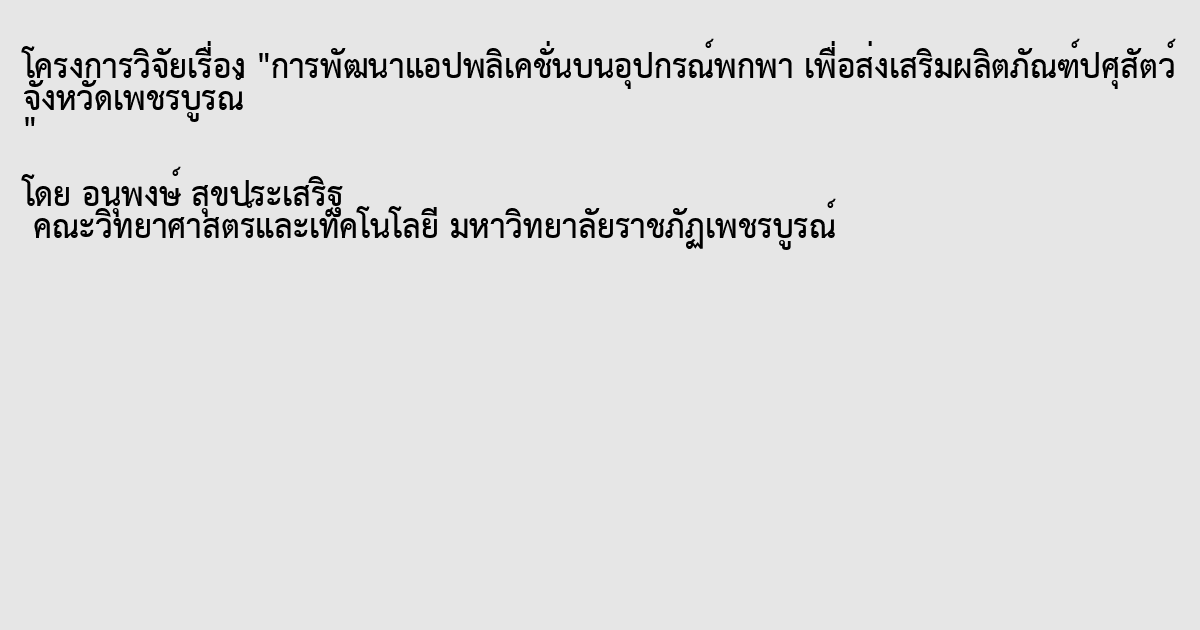 การพัฒนาแอปพลิเคชั่นบนอุปกรณ์พกพา เพื่อส่งเสริมผลิตภัณฑ์ปศุสัตว์ จังหวัดเพชรบูรณ์
