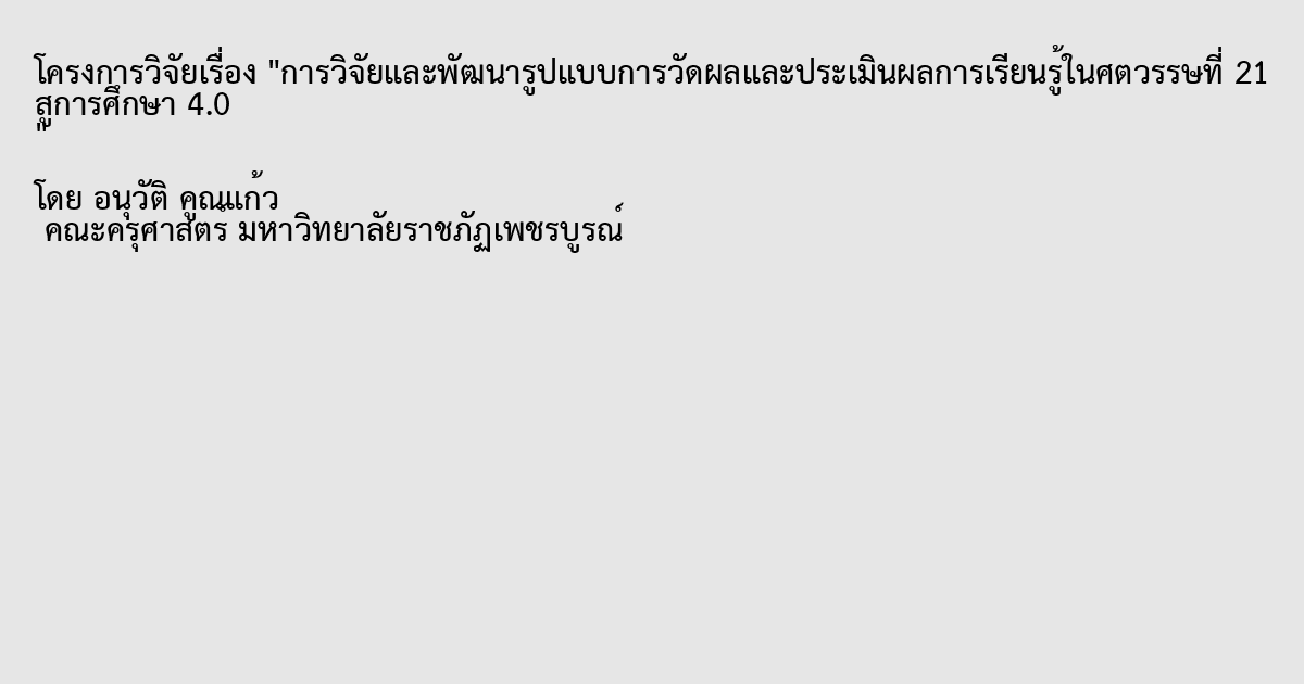การวิจัยครั้งนี้ มีวัตถุประสงค์เพื่อ 1) ศึกษาข้อมูลพื้นฐานสำหรับการพัฒนารูปแบบการวัดผลและประเมินผลการเรียนรู้ในศตวรรษที่ 21 2) สร้างและหาคุณภาพของรูปแบบการวัดผลและประเมินผลการเรียนรู้ในศตวรรษที่ 21 สู่การศึกษา 4.0 3) ทดลองใช้และศึกษาผลการใช้รูปแบบการวัดผลและประเมินผลการเรียนรู้ในศตวรรษที่ 21 สู่การศึกษา 4.0 4) ประเมินความพึงพอใจของนักเรียน และ ครูผู้สอน ที่มีต่อรูปแบบการวัดผลและประเมินผลการเรียนรู้ ในศตวรรษที่ 21 สู่การศึกษา 4.0