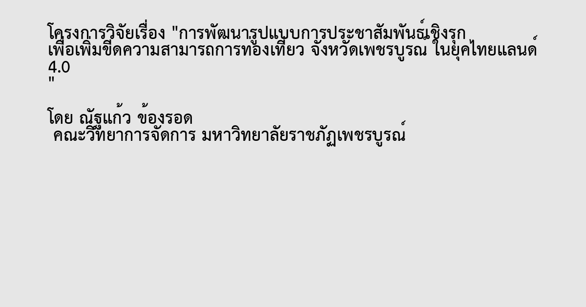 การวิจัยครั้งนี้มีวัตถุประสงค์ เพื่อศึกษาศักยภาพการประชาสัมพันธ์เพื่อการท่องเที่ยวจังหวัดเพชรบูรณ์ ในยุคไทยแลนด์ 4.0 เพื่อพัฒนารูปแบบการประชาสัมพันธ์เชิงรุกเพื่อเพิ่มขีดความสามารถในการท่องเที่ยวจังหวัดเพชรบูรณ์ ในยุคไทยแลนด์ 4.0 และ เพื่อเสนอรูปแบบการประชาสัมพันธ์เชิงรุกเพื่อเพิ่มขีดความสามารถในการท่องเที่ยวจังหวัดเพชรบูรณ์ ในยุคไทยแลนด์ 4.0