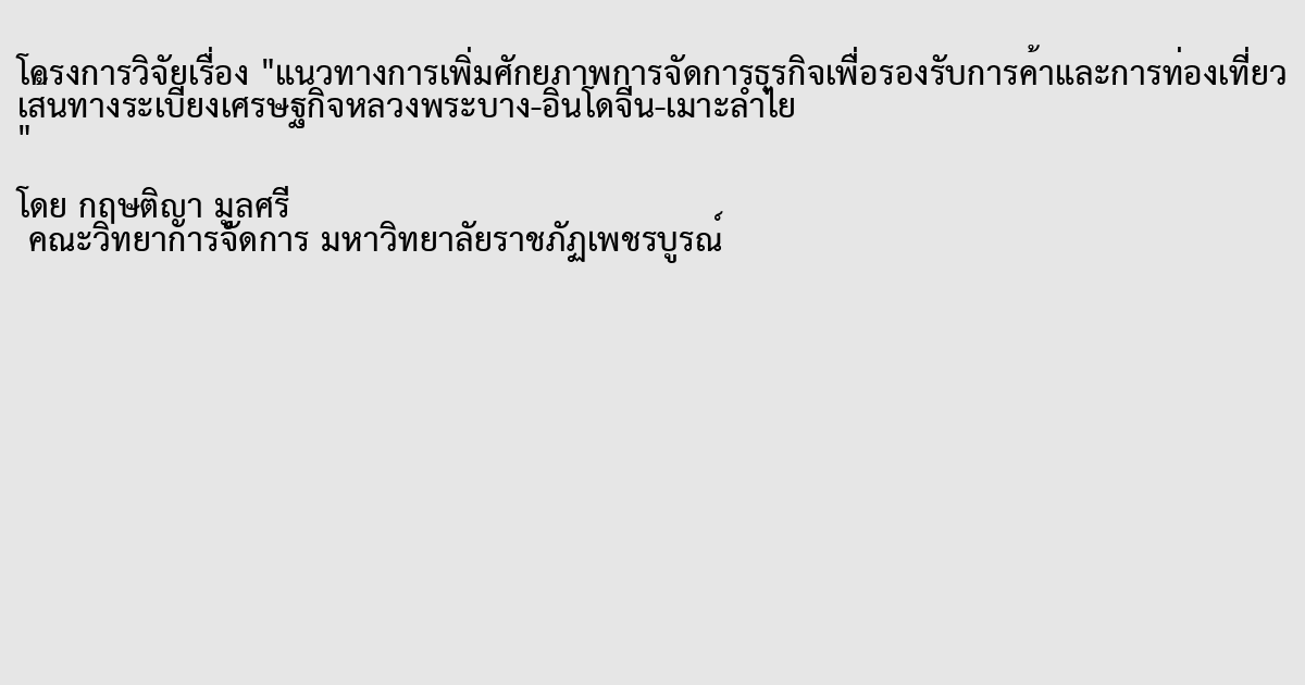 งานวิจัยนี้มีวัตถุประสงค์ เพื่อ 1) เพื่อศึกษาสภาพการจัดการธุรกิจเพื่อรองรับการค้าและการท่องเที่ยวบนเส้นทางระเบียงเศรษฐกิจหลวงพระบาง-อินโดจีน-เมาะลำไย 2) เพื่อศึกษาอิทธิพลของปัจจัยเชิงสาเหตุที่ส่งผลต่อผลสัมฤทธิ์ของธุรกิจเพื่อรองรับการค้าและการท่องเที่ยวบนเส้นทางระเบียงเศรษฐกิจหลวงพระบาง-อินโดจีน-เมาะลำไย 3) เพื่อพัฒนารูปแบบการเพิ่มศักยภาพการจัดการธุรกิจเพื่อรองรับการค้าและการท่องเที่ยวบนเส้นทางระเบียงเศรษฐกิจหลวงพระบาง-อินโดจีน-เมาะลำไย กลุ่มตัวอย่างในการวิจัยคือ ผู้ประกอบการธุรกิจบนเส้นทางระเบียงเศรษฐกิจหลวงพระบาง-อินโดจีน-เมาะลำไย ภาคเหนือตอนล่าง 5 จังหวัด (อุตรดิตถ์ ตาก เพชรบูรณ์ สุโขทัย และพิษณุโลก) จำนวน 540 คน เครื่องมือที่ใช้ในการเก็บรวบรวมข้อมูลคือ แบบสอบถาม และการสัมภาษณ์เชิงลึก สถิติที่ใช้ในการวิเคราะห์ได้แก่ ร้อยละ ค่าเฉลี่ย ส่วนเบี่ยงเบนมาตรฐาน ค่าสัมประสิทธิสหสัมพันธ์เพียร์สัน การวิเคราะห์ปัจจัยเชิงยืนยัน และการวิเคราะห์สมการโครงสร้าง (SEM) ผลการวิจัยพบว่า กลุ่มตัวอย่างมีการจัดการธุรกิจเพื่อรองรับการค้าและการท่องเที่ยวบนเส้นทางระเบียงเศรษฐกิจหลวงพระบาง-อินโดจีน-เมาะลำไย ด้านการดำเนินงานตามกรอบแนวคิดของแมคคินซีย์ อยู่ในระดับมากทุกด้าน โดยด้านโครงสร้างองค์กร มีคะแนนเฉลี่ยมากเป็นอันดับที่ 1 เท่ากับ 4.40 รองลงมาคือ ด้านกลยุทธ์ มีคะแนนเฉลี่ยเท่ากับ 4.34 ด้านค่านิยมร่วม มีคะแนนเฉลี่ยเท่ากับ 4.31 ด้านทักษะ มีคะแนนเฉลี่ยเท่ากับ 4.29 ด้านรูปแบบการบริหาร มีคะแนนเฉลี่ยเท่ากับ 4.26 ด้านพนักงาน มีคะแนนเฉลี่ยเท่ากับ 4.22 และด้านระบบ มีคะแนนเฉลี่ยเท่ากับ 4.18 ตามลำดับ และพบว่าการจัดการคุณภาพโดยรวม ด้านผู้นำ มีค่าคะแนนสูงที่สุด คือมีค่าเฉลี่ยเท่ากับ 4.50 รองลงมาคือ ด้านการมุ่งเน้นลูกค้า มีค่าเฉลี่ยเท่ากับ 4.43 และด้านการจัดการกระบวนการ มีค่าเฉลี่ยเท่ากับ 4.35 ตามลำดับ ในส่วนผลสัมฤทธิ์ของธุรกิจ พบว่า ผลสัมฤทธิ์ด้านลูกค้าสูงที่สุดเป็นอันดับที่ 1 คะแนนค่าเฉลี่ยเท่ากับ 4.30 และรองลงมาคือ ด้านกระบวนการภายใน มีคะแนนค่าเฉลี่ยเท่ากับ 4.27 และด้านการเงิน คะแนนค่าเฉลี่ยเท่ากับ 4.11 ตามลำดับ