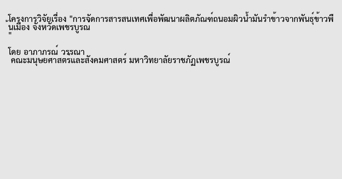 การวิจัยเรื่อง การจัดการสารสนเทศเพื่อพัฒนาผลิตภัณฑ์ถนอมผิวน้ำมันรำข้าวจากพันธุ์ข้าวพื้นเมือง จังหวัดเพชรบูรณ์ มีวัตถุประสงค์เพื่อศึกษาการจัดการสารสนเทศเพื่อพัฒนาผลิตภัณฑ์ถนอมผิวน้ำมันรำข้าวจากพันธุ์ข้าวพื้นเมือง จังหวัดเพชรบูรณ์ ใช้ระเบียบวิธีวิจัยเอกสาร (Documentary research) กลุ่มตัวอย่างข้าวพันธ์พื้นเมือง จังหวัดเพชรบูรณ์ จำนวน 10 ชนิด กำหนดขนาดของกลุ่มตัวอย่างโดยใช้การสุ่มแบบเจาะจง (Purposive random sampling) เครื่องมือที่ใช้ในการวิจัยครั้งนี้เป็นแบบวิเคราะห์เอกสาร วิเคราะห์ข้อมูลโดยวิธีการวิเคราะห์เนื้อหา (Content Analysis)