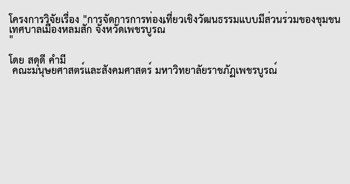 การวิจัยนี้มีวัตถุประสงค์เพื่อ 1) เพื่อศึกษาการจัดการการท่องเที่ยวเชิงวัฒนธรรมแบบมีส่วนร่วมของชุมชนเทศบาลเมืองหล่มสัก อำเภอหล่มสัก จังหวัดเพชรบูรณ์ 2) เพื่อศึกษาปัจจัยที่ส่งผลต่อการจัดการการท่องเที่ยวเชิงวัฒนธรรมแบบมีส่วนร่วมของชุมชนเทศบาลเมืองหล่มสัก อำเภอหล่มสัก จังหวัดเพชรบูรณ์ และ 3) เพื่อนำเสนอแนวทางการจัดการการท่องเที่ยวเชิงวัฒนธรรมแบบมีส่วนร่วมของชุมชนเทศบาลเมืองหล่มสัก อำเภอหล่มสัก จังหวัดเพชรบูรณ์