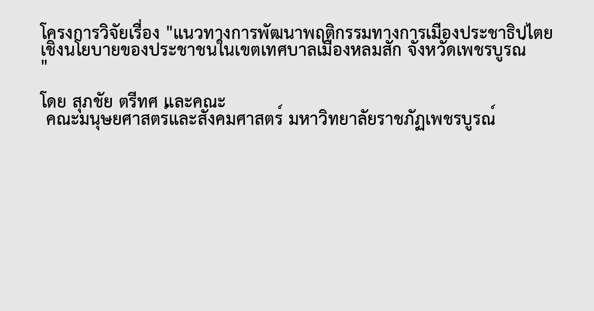 การวิจัยในครั้งนี้ ผู้วิจัยมุ่งศึกษา “แนวทางการพัฒนาพฤติกรรมทางการเมืองประชาธิปไตยเชิงนโยบายของประชาชนในเขตเทศบาลเมืองหล่มสัก จังหวัดเพชรบูรณ์” เป็นการวิจัยแบบผสม (Mixed Research Method) โดยมีวัตถุประสงค์ของการวิจัยคือ มีวัตถุประสงค์เพื่อศึกษา 1) ความรู้ความเข้าใจพฤติกรรมทางการเมืองประชาธิปไตยเชิงนโยบายของประชาชนในเขตเทศบาลเมืองหล่มสัก จังหวัดเพชรบูรณ์ 2) ทัศนคติของประชาชนที่มีต่อปัจจัยการพัฒนาพฤติกรรมทางการเมืองประชาธิปไตยเชิงนโยบายในเขตเทศบาลเมืองหล่มสัก จังหวัดเพชรบูรณ์ 3) ปัจจัยที่ส่งผลต่อการพัฒนาพฤติกรรมทางการเมืองประชาธิปไตยเชิงนโยบายของประชาชนในเขตเทศบาลเมืองหล่มสัก จังหวัดเพชรบูรณ์ 4) นำเสนอแนวทางการพัฒนาพฤติกรรมทางการเมืองประชาธิปไตยเชิงนโยบายของประชาชนในเขตเทศบาลเมืองหล่มสัก จังหวัดเพชรบูรณ์
