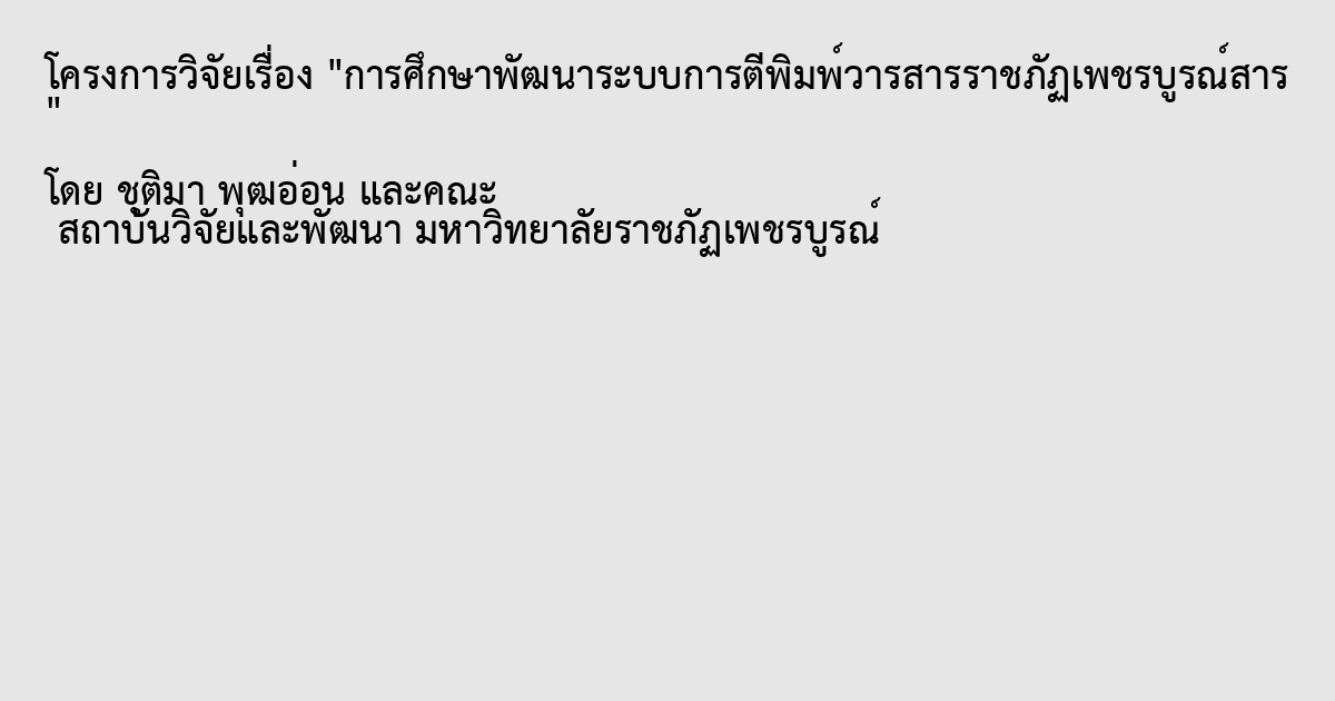 งานวิจัยนี้นำเสนอการศึกษาพัฒนาระบบการตีพิมพ์วารสารราชภัฏเพชรบูรณ์สาร โดยมีวัตถุประสงค์เพื่อศึกษารูปแบบการพัฒนาการตีพิมพ์วารสารราชภัฏเพชรบูรณ์สารอย่างรวดเร็ว มีระบบแบบแผนอย่างชัดเจน มาใช้ในการพัฒนางาน ตามความคิดเห็นของกลุ่มตัวอย่างที่ใช้ประเมินความพึงพอใจประกอบด้วย คณาจารย์ และนักวิจัย ภายในมหาวิทยาลัยราชภัฏเพชรบูรณ์ เพื่อศึกษาความเห็น ปัญหา และข้อเสนอแนะเกี่ยวกับการตีพิมพ์วารสารราชภัฏเพชรบูรณ์สาร จำนวน 5 คณะ ๆ ละ 30 คน รวมทั้งสิ้น 150 คน