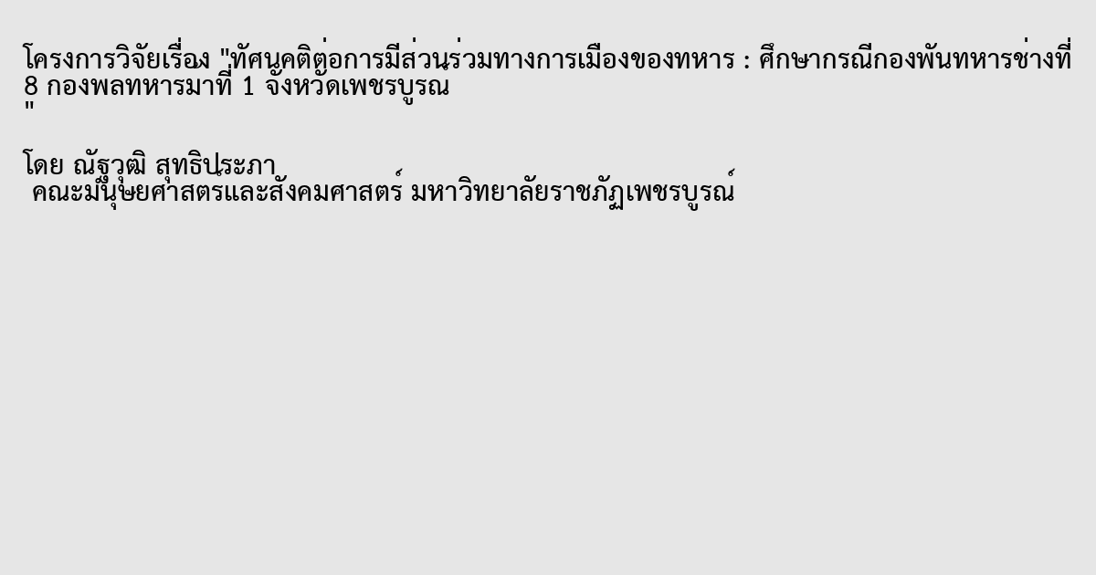 ทัศนคติต่อการมีส่วนร่วมทางการเมืองของทหาร : ศึกษากรณีกองพันทหารช่างที่ 8 กองพลทหารม้าที่ 1 จังหวัดเพชรบูรณ์