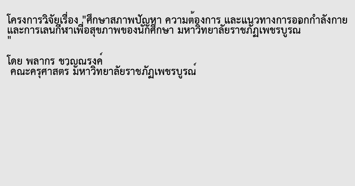 ศึกษาสภาพปัญหา ความต้องการ และแนวทางการออกกำลังกาย และการเล่นกีฬาเพื่อสุขภาพของนักศึกษา มหาวิทยาลัยราชภัฏเพชรบูรณ์