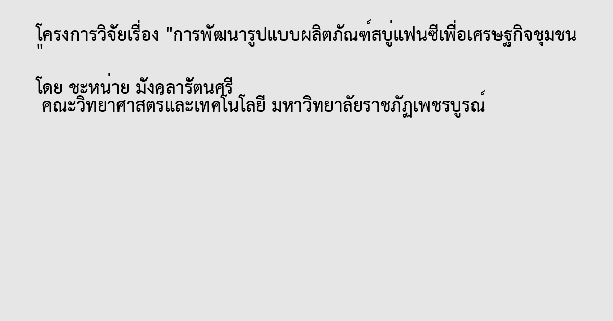 การศึกษาการพัฒนารูปแบบผลิตภัณฑ์สบู่แฟนซีเพื่อเศรษฐกิจชุมชน มีวัตถุประสงค์เพื่อพัฒนารูปแบบต่างๆ การทำผลิตภัณฑ์สบู่แฟนซี และเผยแพร่การทำผลิตภัณฑ์สบู่แฟนซีต่อกลุ่มวิสาหกิจชุมชน ในการวิจัยใช้สบู่ก้อนทึบแสงผสมขมิ้นและสบู่ก้อนใส การทําสบู่แฟนซีมี 2 วิธีดังนี้ วิธีที่ 1 การทําสบู่แฟนซีโดยใช้พิมพ์สบู่รูปแบบต่างๆ ได้สบู่แฟนซี รูปผลไม้ รูปดอกไม้ และรูปสัตว์ วิธีที่ 2 การทำสบู่แฟนซีโดยใช้อุปกรณ์และวิธีการดัดแปลงให้เป็นรูปแบบต่างๆได้สบู่แฟนซี 3 แบบคือ สบู่แฟนซีที่มีวัสดุในเนื้อสบู่ สบู่แฟนซีรูปวงกลมหลายสีซ้อนกัน และสบู่แฟนซีรูปส้ม จากการประเมินความชอบของผู้ประเมินที่มีต่อสบู่แฟนซีที่ได้จากการวิจัย พบว่าคะแนนความชอบที่ระดับ 4 และ 5 รวมกันซึ่งหมายถึง ชอบและชอบมาก ตามลำดับ ผู้ประเมินชอบสบู่หน้าใส 75.% สบู่ที่มีรูปแบบตามพิมพ์สบู่ที่ใช้ 60.4% สบู่ที่มีวัสดุในงานสบู่ 68.8 % สบู่รูปวงกลมหลายสิ่งสำคัญ 60.4 % และสบู่รูปส้ม 75.0 % การซื้อสบู่แฟนซีซื้อให้ตัวเอง 60.4 % ซื้อให้ผู้อื่นโดยซื้อเป็นของฝาก 68.8 % สิ่งที่ใช้พิจารณาในการซื้อสบู่แฟนซีเรียงตามลำดับดังนี้รูปแบบรูปแบบสีกลิ่นน้ำหอมลักษณะเนื้อสบู่และราคาดังนี้คะแนนความชอบโดยรวมเท่ากับ 70 9.1 %