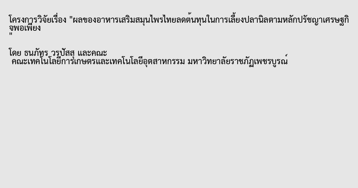 ศึกษาผลของอาหารเสริมสมุนไพรไทยต่อประสิทธิภาพการเจริญเติบโตของปลานิล วางแผนการทดลองแบบสุ่มสมบูรณ์ (Completely Randomized Design : CRD) จำนวน 4 ชุดการทดลอง ได้แก่ 1) อาหารปลานิลที่ไม่เสริมสมุนไพรไทย (CT) 2) อาหารปลานิลที่เสริมด้วยขิง (GG) 3) อาหารปลานิลที่เสริมด้วยกะเพรา (BS) และ 4) อาหารปลานิลที่เสริมด้วยกระเทียม (GL) ชุดการทดลองละ 3 ซ้ำ ทดลองเลี้ยงปลานิลน้ำหนักเฉลี่ย 2.83±0.00 กรัม ในถังไฟเบอร์กลาส ขนาด 500 ลิตร จำนวน 30 ตัวต่อถัง เป็นระยะเวลา 90 วัน เมื่อสิ้นสุดการทดลองพบว่าปลานิลมีน้ำหนักสุดท้าย น้ำหนักที่เพิ่มขึ้น และอัตราการเจริญเติบโตต่อวัน สูงกว่าปลานิลที่ได้รับอาหารควบคุม (CT) อย่างมีนัยสำคัญทางสถิติ (P<0.05) อย่างไรก็ตามไม่มีความแตกต่างทางสถิติ (P>0.05) ของน้ำหนักสุดท้าย น้ำหนักที่เพิ่มขึ้น และอัตราการเจริญเติบโตต่อวัน ปลานิลที่เลี้ยงด้วยอาหารผสมสมุนไพรทั้งสามชนิด ส่วนอัตราการเปลี่ยนอาหารเป็นเนื้อ และอัตราการรอดตายไม่มีความแตกต่างกันของทุกชุดการทดลอง การเสริมสมุนไพรไทยทั้ง 3 ชนิด ช่วยให้ปลานิลมีการเจริญเติบโตที่ดีขึ้น