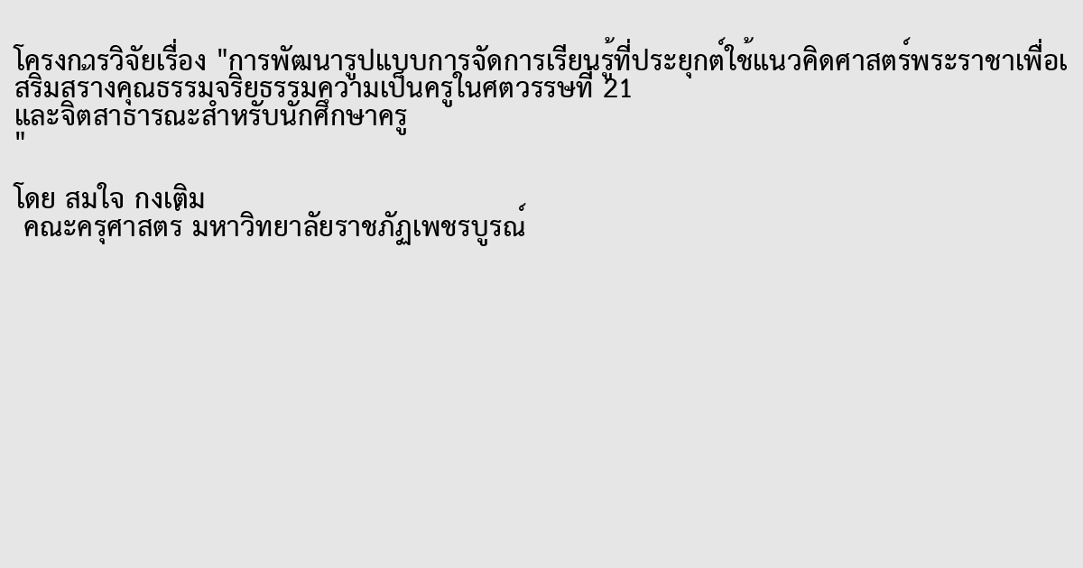 การวิจัยครั้งนี้มีวัตถุประสงค์เพื่อ 1) เพื่อศึกษาการศึกษาสภาพการมีคุณธรรมจริยธรรมความเป็นครูในศตวรรษที่ 21 และจิตสาธารณะของนักศึกษาครู 2) เพื่อพัฒนารูปแบบการจัดการเรียนรู้ที่ประยุกต์ใช้แนวคิดศาสตร์พระราชาเพื่อเสริมสร้างคุณธรรมจริยธรรมความเป็นครูในศตวรรษที่ 21 และจิตสาธารณะ 3)เพื่อทดลองใช้รูปแบบการจัดการเรียนรู้ที่ประยุกต์ใช้แนวคิดศาสตร์พระราชาเพื่อเสริมสร้างคุณธรรมจริยธรรมความเป็นครูในศตวรรษที่ 21 และจิตสาธารณะ 4)เพื่อประเมินความพึงพอใจของนักศึกษาครูที่มีต่อรูปแบบการจัดการเรียนรู้ที่ประยุกต์ใช้แนวคิดศาสตร์พระราชาเพื่อเสริมสร้างคุณธรรมจริยธรรมความเป็นครูในศตวรรษที่ 21 และจิตสาธารณะ