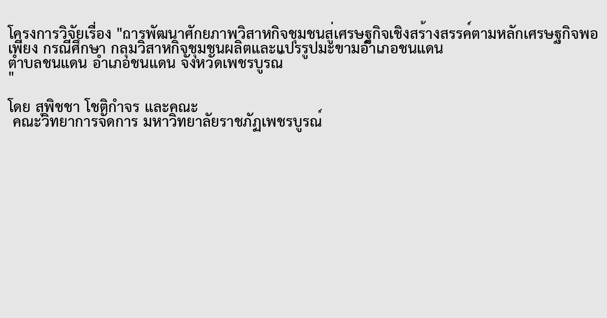 งานวิจัยนี้มีวัตถุประสงค์คือ 1) เพื่อศึกษาถึงสภาพปัญหาและปัจจัยที่เกี่ยวข้องกับการดำเนินงานกลุ่มวิสาหกิจชุมชนผลิตและแปรรูปมะขามอำเภอชนแดน และ 2) เพื่อศึกษาแนวทางในการพัฒนากลุ่มวิสาหกิจชุมชนผลิตและแปรรูปมะขามอำเภอชนแดนสู่เศรษฐกิจเชิงสร้างสรรค์ตามหลักเศรษฐกิจพอพอเพียง โดยรวบรวมข้อมูลจากการสังเกตแบบไม่มีส่วนร่วม การสัมภาษณ์ แบบเจาะลึก และการประชุมแบบมีส่วนร่วม โดยมีกลุ่มผู้ให้ข้อมูลหลักจากแหล่งข้อมูลที่หลากหลาย รวมจำนวน 21 คน ทำการวิเคราะห์ข้อมูลโดยใช้วิธีการเชิงพรรณนา