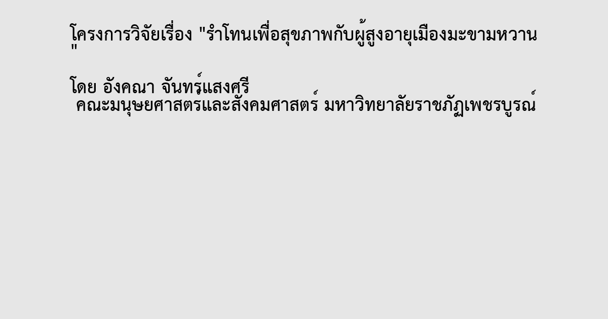 การวิจัยครั้งนี้มีวัตถุประสงค์เพื่อศึกษาประวัติความเป็นมาของรำโทน เพลงรำโทน ท่ารำโทนเพื่อสุขภาพกับผู้สูงอายุเมืองมะขามหวานและการถ่ายทอดองค์ความรู้รำโทนสู่ชุมชน