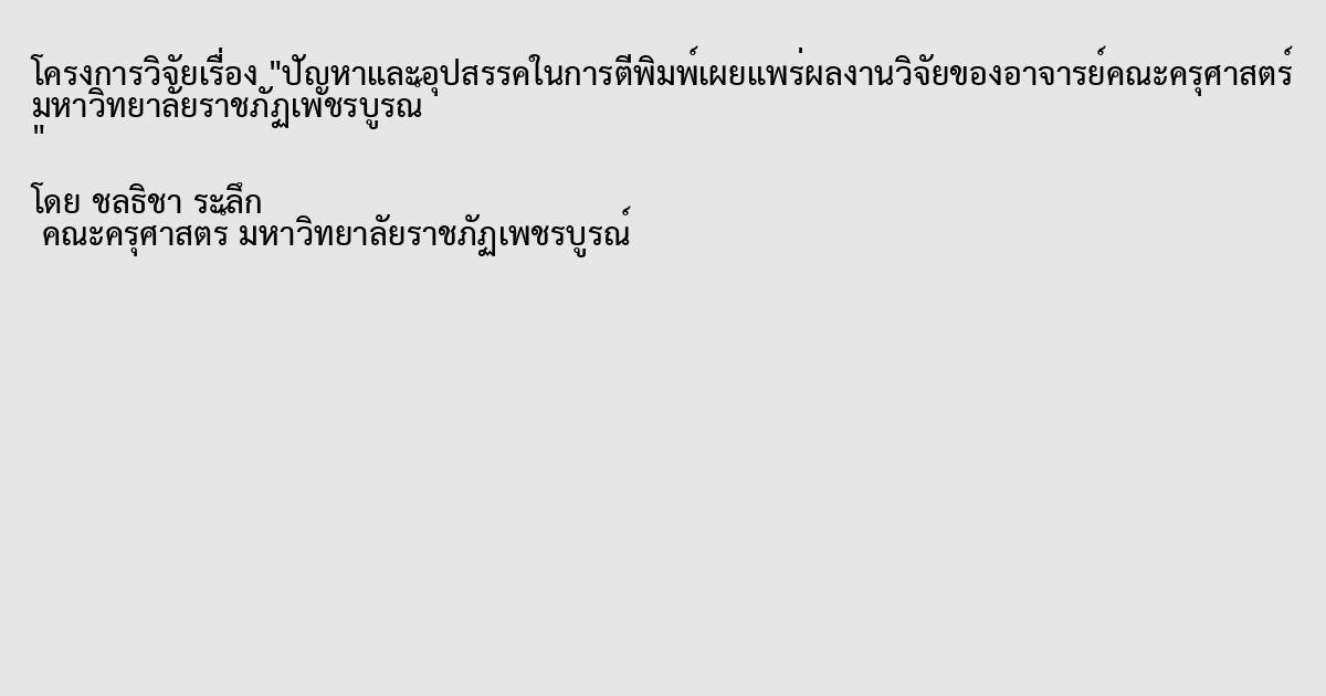 งานวิจัยนี้มีวัตถุประสงค์เพื่อการศึกษาปัญหาและอุปสรรคในการการตีพิมพ์เผยแพร่ผลงานวิจัยของอาจารย์ คณะครุศาสตร์ มหาวิทยาลัยราชภัฏเพชรบูรณ์ เก็บรวบรวมข้อมูลโดยใช้แบบสอบถามกับกลุ่มตัวอย่างซึ่งเป็นอาจารย์ของคณะครุศาสตร์ จำนวน 37 คน ผู้วิจัยได้ดำเนินการวิเคราะห์ข้อมูลที่ได้จากแบบสอบถาม ได้แก่ ค่าเฉลี่ยเลขคณิต และค่าส่วนเบี่ยงเบน