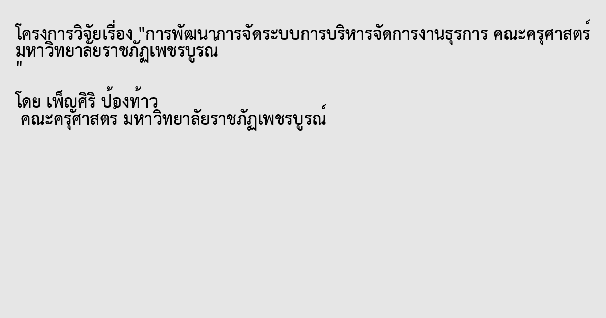 ผลของงานวิจัยนี้ประกอบด้วย ด้านการจัดระบบบริหารจัดการงานธุรการคณะครุศาสตร์ มหาวิทยาลัยราชภัฏเพชรบูรณ์ความสามารถในการปฏิบัติตามแผน อยู่ในระดับมาก ( x̄ = 4.14, S.D. = 0.67) และเมื่อพิจารณาเป็นรายข้อ พบว่า ความสามารถในการปฏิบัติตามแผน อยู่ในระดับมาก ( x̄ = 4.36 , S.D. = 0.48) ประเด็นของความเพียงพอของจำนวนบุคลากรผู้ปฏิบัติงาน ความเหมาะสมในการจัดบุคลากรปฏิบัติงานธุรการแต่ละงาน อยู่ในระดับมาก ( x̄ = 4.34, S.D. = 0.66) และความพอเพียงของเครื่องมือ อุปกรณ์สำนักงานที่ใช้ในการปฏิบัติงานธุรการ ( x̄ = 4.19, S.D. = 0.57) และความทันสมัยของอุปกรณ์ที่ใช้ในการปฏิบัติงานในงานธุรการ ( x̄ = 4.14, S.D. = 0.62) และด้านการดำเนินงานธุรการ คณะครุศาสตร์ มหาวิทยาลัยราชภัฏเพชรบูรณ์ อยู่ในระดับมาก ( x̄ = 4.11, S.D. = 0.76) และเมื่อพิจารณาเป็นรายข้อ พบว่า ประเด็นเรื่องการลงทะเบียน รับ-ส่งเอกสารและหนังสือราชการถูกต้องตามระเบียบมีค่าเฉลี่ยอยู่ในระดับมาก ( x̄ = 4.34, S.D. = 0.86) มีเจ้าหน้าที่รับผิดชอบในการดำเนินงานลงทะเบียน รับ – ส่ง โดยเฉพาะ ( x̄ = 4.29, S.D. = 0.65) มีสมุดทะเบียนรับ-ส่งเอกสารและหนังสือราชการ ( x̄ = 4.21, S.D. = 0.85) มีการใช้เทคโนโลยีเข้ามาช่วยสนับสนุนงานสารบรรณ ( x̄ =4.19, S.D. = 0.74) มีการติดตามการปฏิบัติงานของบุคลากรงานสารบรรณอย่างสม่ำเสมอ ( x̄ = 4.10, S.D. = 0.69) และมีบุคลากรที่มีความรู้ความสามารถในการปฏิบัติงานอย่างเหมาะสม ( x̄ = 4.08, S.D. = 0.82) ข้อเสนอแนะคือควรมีการจัดอบรมให้ความรู้ ความเข้าใจแก่บุคลากรทั้งทางทฤษฎีและภาคปฏิบัติ ผู้บริหารควรให้กำลังใจผู้ปฏิบัติงาน ควรจัดทำคู่มือปฏิบัติงาน จัดเตรียมอุปกรณ์ให้เพียงพอต่อความต้องการของบุคลากร