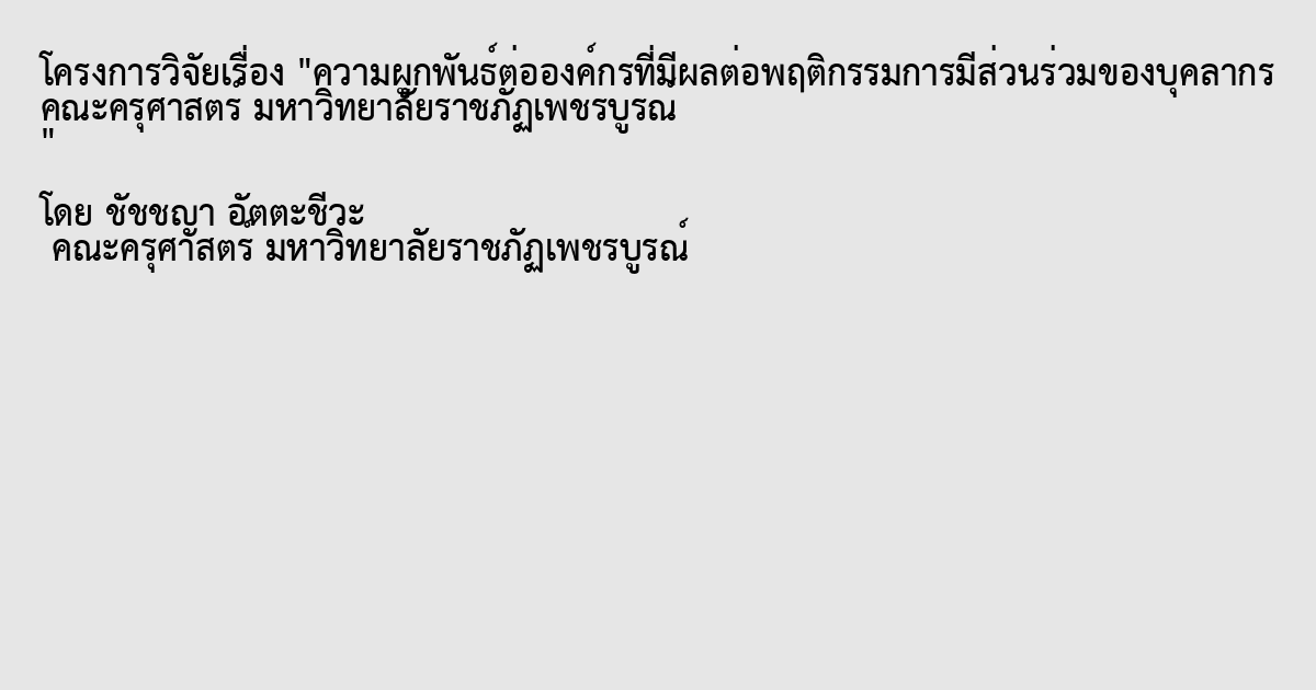 ความผูกพันธ์ต่อองค์กร,การมีส่วนร่วม,อาจารย์และเจ้าหน้าที่คณะครุศาสตร์ มหาวิทยาลัยราชภัฏเพชรบูรณ์,Relationships with the organization,participations,faculty and staff of the Faculty of Education Rajabhat University Phetchabun.