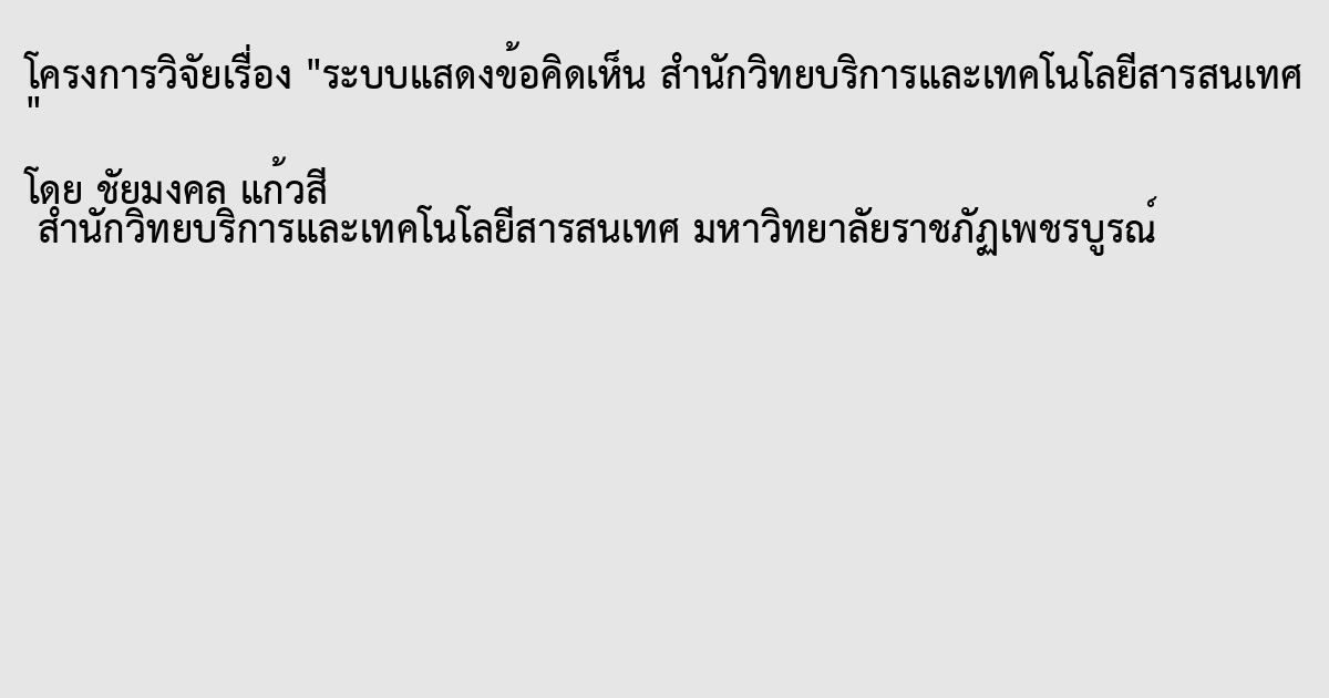 การจัดทำวิจัยครั้งนี้ได้ทำการพัฒนระบบแสดงข้อคิดเห็น สำนักวิทยบริการและเทคโนโลยีสารสนเทศ มีวัตถุประสค์เพื่อให้กาแสดงข้อคิดเห็น เป็นไปด้วยความสะดวก รวดเร็ว ทันสมัย ด้วยการทำงานผ่านระบบเครือข่ายคอมพิวเตอร์ และอำนวยความสะดวกให้แก่เจ้าหน้าที่ ที่รับผิดชอบในการจัดเก็บ และประมวลผลข้อมูลข้อคิดเห็น ให้สามารถทำงานได้รวดเร็วยิ่งขึ้น ด้วยการออกแบบที่ทำให้ผู้ใช้งาน สามารถใช้งานได้ง่ย มีฟังก์ชั่นในการตรวจสอบแหล่งที่มาของข้อมูล และแจ้งเตือนไปยังเจ้าหน้าที่ผู้มีส่วนเกี่ยวข้องในทันที มื่อมีการแสดงข้อคิดเห็น สะดวก รวดเร็ว