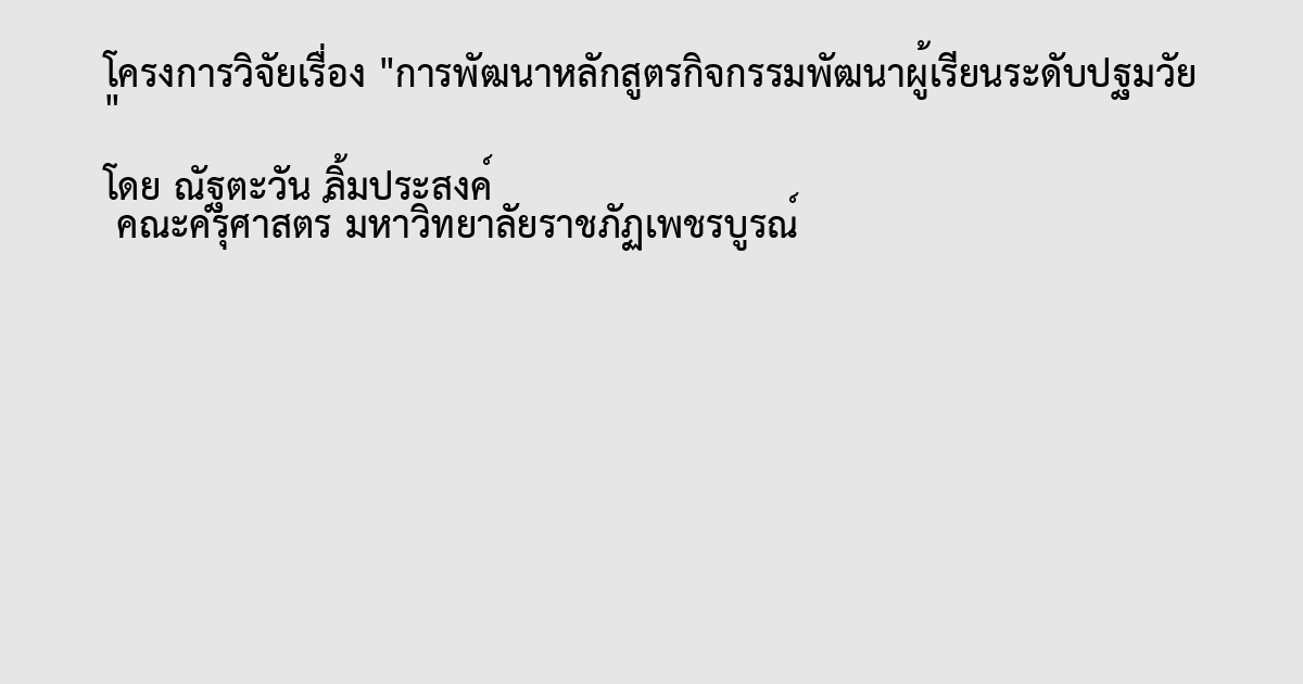 การวิจัยเรื่อง “การพัฒนาหลักสูตรกิจกรรมพัฒนาผู้เรียนระดับปฐมวัย”ครั้งนี้ เป็นการวิจัยเพื่อพัฒนา ตอบสมมุติฐานการวิจัย คือ 1) รูปแบบหลักสูตรกิจกรรมพัฒนาผู้เรียนระดับปฐมวัยที่สร้างขึ้นสามารถนำไปบูรณาการใช้ได้กับสถานศึกษาอื่นที่เปิดสอนในระดับปฐมวัยได้ 2) รูปแบบหลักสูตรกิจกรรมพัฒนาผู้เรียนระดับปฐมวัยที่สร้างขึ้นเป็นพหุองค์ประกอบ มีความเหมาะสม มีความเป็นไปได้ เป็นประโยชน์ และมีความถูกต้องครอบคลุมตามทฤษฎี ประชากรคือ สถานศึกษาขั้นพื้นฐานในจังหวัดเพชรบูรณ์และจังหวัดพิษณุโลก กลุ่มตัวอย่างได้จากการเลือกแบบเจาะจงจำนวน 4 แห่ง ประกอบด้วย โรงเรียนบ้านดง โรงเรียนตาดหมอกวิทยา โรงเรียนวัดกรับพวง และโรงเรียนหนองกระบาก การดำเนินงานแบ่งเป็น 2 กิจกรรม กิจกรรมแรกสัมมนากลุ่มผู้ทรงคุณวุฒิ 5 คน ได้ร่างรูปแบบการพัฒนาหลักสูตรกิจกรรมพัฒนาผู้เรียนระดับปฐมวัย กิจกรรมที่ 2 นำร่างรูปแบบการพัฒนาหลักสูตรกิจกรรมพัฒนาผู้เรียนระดับปฐมวัยไปใช้โดยจัดโครงการอบรมเชิงปฏิบัติการ เรื่อง การพัฒนาหลักสูตรกิจกรรมพัฒนาผู้เรียนระดับปฐมวัย (ลูกเสือ-เนตรนารีจูเนียร์) จัดนิเทศ กำกับ ติดตามการนำกิจกรรมจากโครงการฯ ระยะที่ 1 และ 2 ประเมินสรุปเป็นองค์ความรู้ใหม่ ยืนยันรูปแบบโดยผู้ทรงคุณวุฒิ สถิติที่ใช้ได้แก่ ค่าความถี่ (f) ค่าเฉลี่ย ( x̄) ค่าร้อยละ (p) ส่วนเบี่ยงเบนมาตรฐาน (S.D.) และวิเคราะห์เนื้อหา