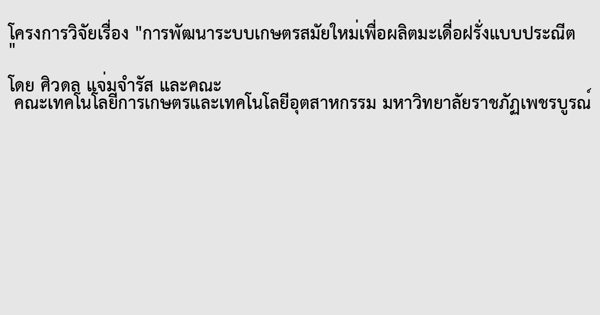 การพัฒนาระบบเกษตรสมัยใหม่เพื่อผลิตมะเดื่อฝรั่งแบบประณีตประกอบไปด้วย 3 โครงการย่อยได้แก่ 1) การศึกษาปัจจัยการผลิตที่เหมาะสมต่อการปลูกมะเดื่อฝรั่งโดยมุ่งเน้นศึกษาการใช้ปุ๋ยจากมูลนกกระทาที่เหมาะสมต่อการเจริญเติบโตของมะเดื่อฝรั่ง วางแผนการทดลองแบบสุ่มบล็อกสมบูรณ์ (Randomized Complete Block Design ; RCBD) ซึ่งมีทั้งหมด 3 สิ่งทดลอง จำนวน 6 ซ้ำ ซ้ำละ 1 ต้น ใช้ต้นมะเดื่อฝรั่งในการทดลองทั้ง 18 ต้น ดังนี้ สิ่งทดลองที่ 1 ไม่ใส่ปุ๋ย สิ่งทดลองที่ 2 ใส่ปุ๋ยนกกระทา ใส่อัตรา 1,500 กิโลกรัมต่อไร่ สิ่งทดลองที่ 3 ใส่ปุ๋ยมูลนกกระทา อัตรา 2,000 กิโลกรัมต่อไร่ จากการทดลองพบว่า วันที่ 156 วัน ความสูง ขนาดลำต้น ปริมาณคลอโรฟิลล์ น้ำหนักผลต่อต้น และปริมาณของแข็งที่ละลายน้ำที่ได้ทั้งหมด (TSS) ไม่มีความแตกต่างกันทางสถิติ หลังจากการทดลอง จำนวนใบทั้งต้น 100 วัน และขนาดทรงพุ่ม 30 วัน พบว่า การใส่ปุ๋ย 1,500 กิโลกรัมต่อไร่ให้มากว่าการใส่ปุ๋ย 2,000 กิโลกรัมต่อไร่และการไม่ใส่ปุ๋ย โดยจำนวนใบมีค่าเท่ากับ 83.83±27.00 ใบ และ 70.17±20.39 57 ถึง 41.17±20.33 ใบ และขนาดทรงพุ่มโดยมีค่าเท่ากับ 25.29±6.16 เซนติเมตร และ 18.11±4.98 57 ถึง 14.98±7.16 เซนติเมตร น้ำหนักต่อผล พบว่า การใส่ปุ๋ย 2,000 กิโลกรัมต่อไร่ให้มากกว่าใส่ปุ๋ย 1,500 กิโลกรัมต่อไร่และไม่ใส่ปุ๋ย โดยมีค่าเท่ากับ 26.62±20.18 กรัม และ 24.07±24.04 ถึง 10.08±0.22 กรัม ซึ่งมีความแตกต่างทางสถิติอย่างมีนัยสำคัญที่ระดับความเชื่อมั่น 95 เปอร์เซ็นต์ (p<0.05) สำหรับเส้นผ่าศูนย์กลางผลและความสูงผล พบว่า การใส่ปุ๋ย 2,000 กิโลกรัมต่อไร่ได้มากกว่าใส่ปุ๋ย 1,500 กิโลกรัมต่อไร่และใส่ปุ๋ย โดยเส้นผ่าศูนย์กลางผลโดยมีค่าเท่ากับ 37.02±11.01 มิลลิเมตร และ 34.82±13.04 ถึง27.65±0.81 มิลลิเมตร และความสูงผลโดยมีค่าเท่ากับ 34.34±8.29 มิลลิเมตร และ 33.78±11.76 ถึง 27.08±0.83 มิลลิเมตร ซึ่งมีความแตกต่างทางสถิติอย่างมีนัยสำคัญยิ่งที่ระดับความเชื่อมั่น 99 เปอร์เซ็นต์ (p<0.01)