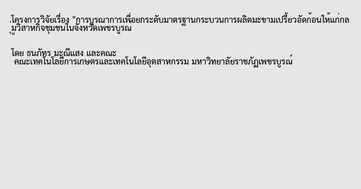 งานวิจัยชิ้นนี้มีวัตถุประสงค์เพื่อแก้ปัญหาจากกระบวนการผลิตแบบเดิม และเพิ่มประสิทธิภาพกรรมวิธีการผลิตมะขามเปียกอัดก้อนให้สามารถทำได้ง่ายยิ่งขึ้น รวมถึงลดต้นทุนการผลิต เพื่อทำให้กลุ่มวิสหกิจมีศักภาพที่สามารถแข่งขันกับคู่แข่งได้ โดยแบ่งการดำเนินการออกเป็น 3 ส่วน ประกอบด้วย 1) การพัฒนาระบบการควบคุมป้อนกลับในกระบวนการอบเพื่อยับยั้งการเจริญเติบโตของเชื้อจุลินทรีย์ โดยใช้อาศัยแรงลมจากใบพัดและแผงควบคุม เพื่อช่วยทิศทางความร้อนให้ความร้อนสามารถไปในทิศทางที่ต้องการ และทำงานแบบอัตโนมัติโดยอาศัยระบบการควบคุมป้อนกลับ ทำให้ประหยัดพลังงานกว่าตู้อบที่ใช้ในปัจจุบัน 2) การพัฒนาบรรจุภัณฑ์สำหรับมะขามเปียกอัดก้อน ซึ่งอาศัยเทคนิคการพัฒนาผลิตภัณฑ์ใหม่ด้วยวิศวกรรมคันไซ โดยมุ่งเน้นให้การเลือกวัสดุที่ไม่เป็นอันตรายต่อผู้บริโภค รวมถึง มีสี กลิ่น รสชาติ อยู่ในช่วงคุณภาพที่ผู้บริโภคต้องการ และมีรายละเอียดในฉลากครบถ้วนตามมาตรฐานที่ถูกกำหนดไว้ และ 3) การพัฒนาเครื่องอัดก้อนมะขามเปรี้ยวโดยใช้ระบบนิวเมติกส์ ที่สามารถอัดมะขามเปรี้ยวให้เป็นรูปสี่เหลี่ยมขนาด 12 x14 x 4 เซนติเมตร น้ำหนัก 454 กรัมหรือประมาณ 16 OZ ตามความต้องการของกลุ่มวิสาหกิจชุมชนผู้แปรรูปมะขามจังหวัดเพชรบูรณ์ โดยเน้นการออกแบบจะเน้นให้เครื่องสามารถใช้งานง่าย มีน้ำหนักเบา มีระบบความปลอดภัย และสามารถทำงานได้รวดเร็วว่าการทำงานแบบเดิม