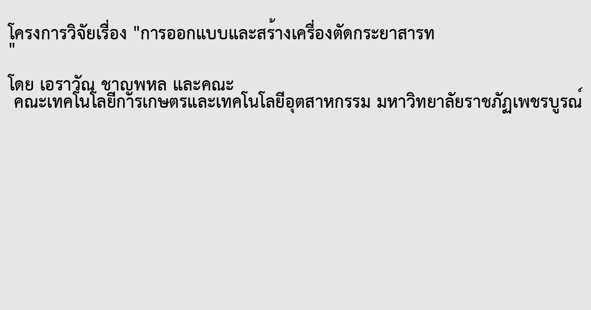 การศึกษาวิจัยครั้งนี้คณะผู้วิจัยมีวัตถุประสงค์ที่จะทำการออกแบบและสร้างเครื่องตัดขนมกระยาสารท เพื่อทดสอบสมรรถนะของเครื่องตัดขนมกระยาสารท และประเมินความคิดเห็นของผู้ใช้งานเครื่อง การทดสอบสมรรถนะของเครื่องตัดขนมกระยาสารท ทางคณะผู้วิจัยได้ทำผลการทดสอบเพื่อหาสมรรถนะของเครื่องตัดขนมกระยาสารท โดยการทดสอบการทำงาน ประกอบด้วย การนำขนมกระยาสารทใส่ถาดอัดให้สม่ำเสมอ ป้อนเข้าไปยังช่องตัวกระแรกจากนั้นขับเคลื่อนส่งไปยังใบมีตัด แล้วหมุนกลับด้านเพื่อส่งไปยังใบมีตัดอีกด้าน จากนั้นบันทึกเวลาที่ได้ และผลการประเมินความคิดเห็นของผู้ใช้เครื่องตัดขนมกระยาสารท จำนวน 30 คน โดยภาพรวมทั้งหมด 4 ด้าน ประกอบด้วย การนำขนมกระยาสารทใส่ถาดอัดให้สม่ำเสมอ ป้อนเข้าไปยังช่องตัวกระแรกจากนั้นขับเคลื่อนส่งไปยังใบมีตัด แล้วหมุนกลับด้านเพื่อส่งไปยังใบมีตัดอีกด้าน จากนั้นบันทึกเวลาที่ได้ ด้านการออกแบบ ด้านความปลอดภัย ด้านความสะดวกในการใช้งาน และด้านผลผลิตที่ได้ อยู่ในเกณฑ์มาก ซึ่งมีค่าเฉลี่ยรวมเท่ากับ 4.44