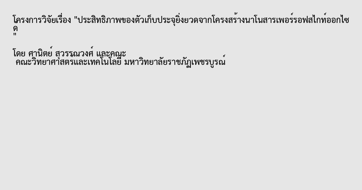 ในปัจจุบัน นาโนเทคโนโลยีมีความสำคัญเป็นอย่างมากในการผลิตและพัฒนาแหล่งกักเก็บพลังงานอย่างเช่น ตัวเก็บประจุยิ่งยวด โดยใช้สารนาโนคาร์บอนในการทำเป็นขั้ว ซึ่งมีรูพรุนสูง ทำให้สามารถอัดประจุได้รวดเร็วและกักเก็บประจุได้ในปริมาณมาก และเมื่อเพิ่มชั้นของเยื่อเลือกผ่านซึ่งเป็นชั้นคั่นกลางระหว่างชั้นนาโนคาร์บอน จะทำให้กักเก็บประจุไฟฟ้าได้มากยิ่งขึ้น ในงานวิจัยนี้ได้ใช้สารนาโนเพอร์รอฟสไกท์ออกไซด์เติมลงไปในชั้นคั่นกลาง โดยการเตรียมสารนาโนเพอร์รอฟไกท์ ได้แก่ CaTiO3 BaTiO3 SrTiO3 ZnTiO3 และ CuTiO3 ด้วยวิธีอย่างง่าย แล้วทำการเผาผนึกอนุภาคที่อุณหภูมิ 1,000°C เป็นเวลา 8 ชั่วโมง จากนั้นนำมาผสมกับสารละลายของสาร Polysulfon (PSF) เพื่อทำชั้นคั่นกลางที่เติมสารเพอร์รอฟสไกท์ในสัดส่วน 0.5% 1.0% และ 2.0%wt ตามลำดับ