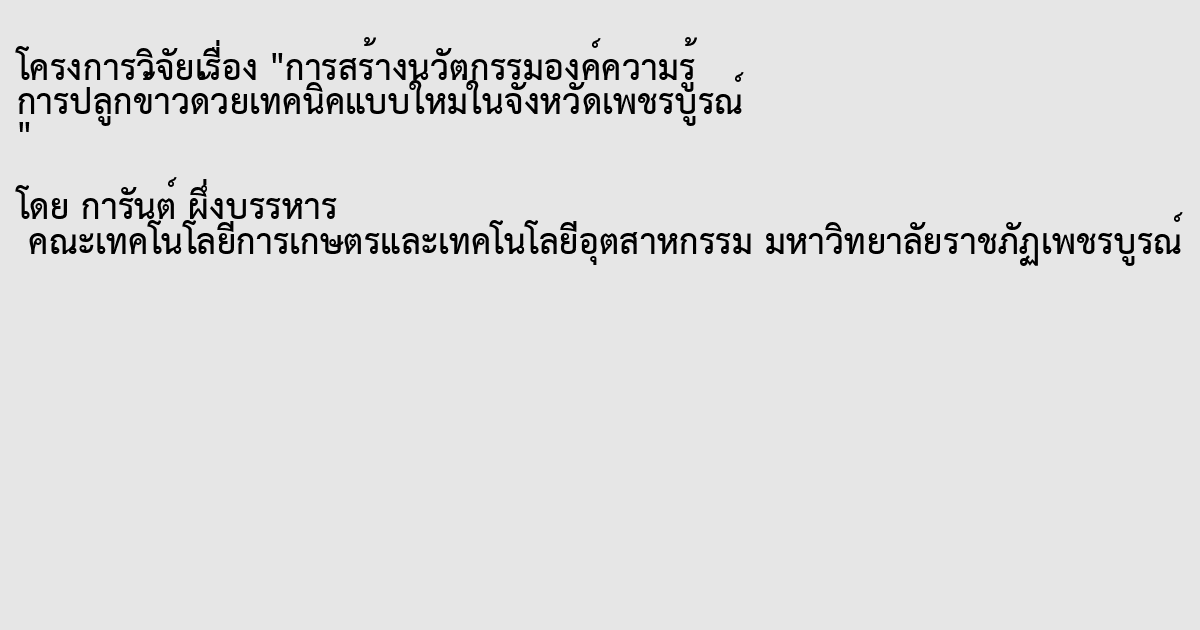 การพัฒนาปุ๋ยอินทรีย์ในรูปแบบก้อนปลูกต่อการเจริญเติบโตของข้าวพันธุ์พิษณุโลก 2 พัฒนาปุ๋ยอินทรีย์ในรูปแบบก้อนปลูก 3 สูตร จากปุ๋ยอินทรีย์ 3 ชนิดได้แก่ ขี้วัว ขี้เค้ก ปุ๋ยหมักเติมอากาศ จากนั้นศึกษาปริมาณธาตุอาหาร นำปุ๋ยอินทรีย์ในรูปแบบก้อนปลูกที่พัฒนาเปรียบเทียบกับปุ๋ยเคมี 27 – 12 – 6 (ชุดควบคุม) เพื่อศึกษาการเจริญเติบโตของข้าวพันธุ์พิษณุโลก 2 ซึ่ง วางแผนการทดลองแบบบล็อกสุ่มสมบูรณ์ Randomized complete block design(RCBD) จำนวน 4 สิ่งทดลองจำนวน 2 ซ้ำ ประกอบด้วย สิ่งทดลองที่ 1 ปลูกแบบปักดำ ใส่ปุ๋ยเคมี 27 -12 – 6 (ชุดควบคุม) อัตรา 30 กิโลกรัมต่อไร่ สิ่งทดลองที่ 2 ก้อนปลูกขี้วัว สิ่งทดลองที่ 3 ก้อนปลูกปุ๋ยหมัก และสิ่งทดลองที่ 4 ก้อนปลูกขี้เค้ก พบว่า ความสูง จำนวนต้นต่อกอ จำนวนรวงต่อกอ น้ำหนักต้นแห้ง น้ำหนักรากแห้ง น้ำหนักเมล็ดข้าว 1000 เมล็ด จำนวนเมล็ดต่อรวง ไม่มีความแตกต่างกันอย่างมีนัยสำคัญทางสถิติ (P<0.05) ในขณะที่ จำนวนเมล็ดดีก้อนปลูกขี้เค้กมีจำนวนเมล็ดดีสูงสุด แตกต่างกันอย่างมีนัยสำคัญทางสถิติต่อชุดควบคุม ที่มีจำนวนเมล็ดดีต่ำที่สุด