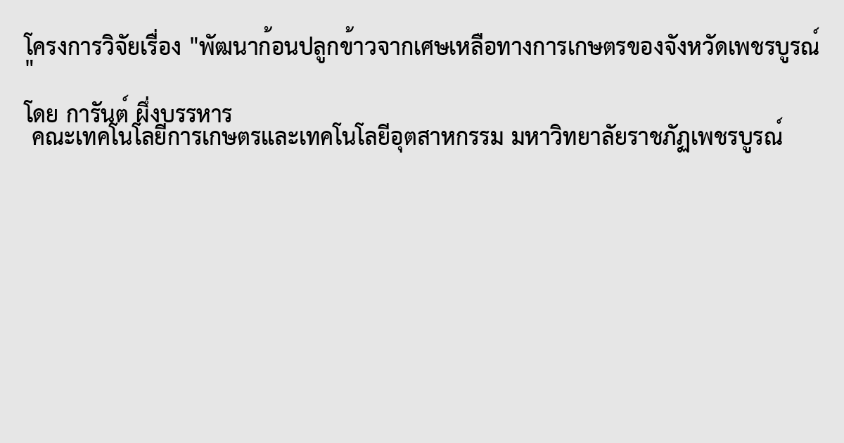 Development of slow release fertilizer formulations for the growth of rice varieties Phitsanulok 2 The experiment was divided into 2 experiments. Experiment 1 developed 12 slow- release fertilizers from 3 types of organic fertilizers, namely cow manure, aerated compost, filter cake Study the nutrient content compared with the standard of organic chemical fertilizers according to the Department of Agriculture. Experiment 2 was used to compare the developed slow release fertilizer formula with chemical fertilizer 27-12-6 (control set) to study the growth of rice varieties Phitsanulok 2. Plan a randomized complete block design (RCBD) of 13 trials, 3 repetitions, consisting of experiment 1, chemical fertilizer 27-12-6 (farmers method control set), rate 30 kg / rai, experiment 2, 3,4,5,6,7,8,9,10,11,12 and 13 slow release fertilizers at the rate of 50 kg / rai It was found that the slow-dissolving fertilizer formula was high. Number of plants per clump Number of ears per clump Dry plant weight Dry root weight Good seed percentage Percent of Lose Weight 1000 Seeds, Harvest Index At a higher level The control set was statistically significant (P <0.05), while the number of seeds per grain. Plant yield per clump yield per rai showed slow-dissolving fertilizers and chemical fertilizers 27-12-6 (control) without statistically significant difference (P <0.05) with confidence level of 95 percent.