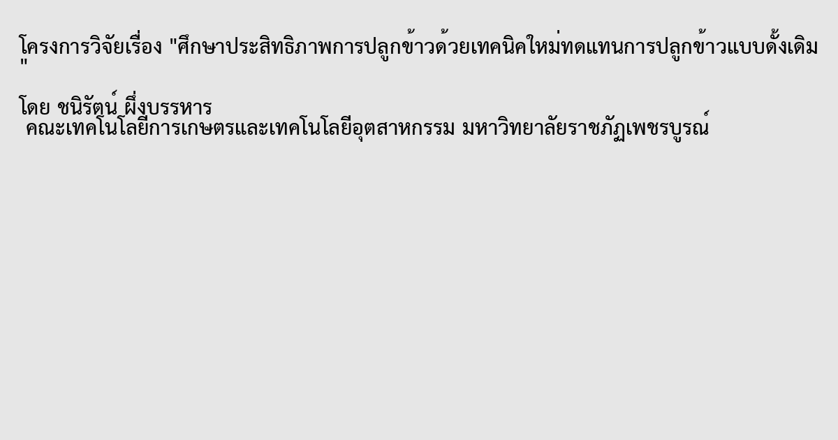 การพัฒนาปุ๋ยอินทรีย์ในรูปแบบก้อนปลูกต่อการเจริญเติบโตของข้าวพันธุ์พิษณุโลก 2 พัฒนาปุ๋ยอินทรีย์ในรูปแบบก้อนปลูก 3 สูตร จากปุ๋ยอินทรีย์ 3 ชนิดได้แก่ ขี้วัว ขี้เค้ก ปุ๋ยหมักเติมอากาศ จากนั้นศึกษาปริมาณธาตุอาหาร นำปุ๋ยอินทรีย์ในรูปแบบก้อนปลูกที่พัฒนาเปรียบเทียบกับปุ๋ยเคมี 27 – 12 – 6 (ชุดควบคุม) เพื่อศึกษาการเจริญเติบโตของข้าวพันธุ์พิษณุโลก 2 ซึ่ง วางแผนการทดลองแบบบล็อกสุ่มสมบูรณ์ Randomized complete block design(RCBD) จำนวน 4 สิ่งทดลองจำนวน 2 ซ้ำ ประกอบด้วย สิ่งทดลองที่ 1 ปลูกแบบปักดำ ใส่ปุ๋ยเคมี 27 -12 – 6 (ชุดควบคุม) อัตรา 30 กิโลกรัมต่อไร่ สิ่งทดลองที่ 2 ก้อนปลูกขี้วัว สิ่งทดลองที่ 3 ก้อนปลูกปุ๋ยหมัก และสิ่งทดลองที่ 4 ก้อนปลูกขี้เค้ก พบว่า ความสูง จำนวนต้นต่อกอ จำนวนรวงต่อกอ น้ำหนักต้นแห้ง น้ำหนักรากแห้ง น้ำหนักเมล็ดข้าว 1000 เมล็ด จำนวนเมล็ดต่อรวง ไม่มีความแตกต่างกันอย่างมีนัยสำคัญทางสถิติ (P<0.05) ในขณะที่ จำนวนเมล็ดดีก้อนปลูกขี้เค้กมีจำนวนเมล็ดดีสูงสุด แตกต่างกันอย่างมีนัยสำคัญทางสถิติต่อชุดควบคุม ที่มีจำนวนเมล็ดดีต่ำที่สุด