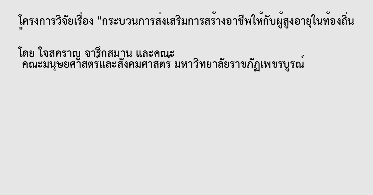 งานวิจัยนี้มีวัตถุประสงค์ในการวิจัยทั้งหมด 3 วัตถุประสงค์ได้แก่ 1) เพื่อศึกษาความต้องการการส่งเสริมการสร้างอาชีพเสริมให้กับผู้สูงอายุในท้องถิ่น 2) เพื่อส่งเสริมการสร้างอาชีพเสริมให้กับผู้สูงอายุในท้องถิ่น และ 3) เพื่อส่งเสริมการมีรายได้ให้กับผู้สูงอายุในท้องถิ่น โดยดำเนินการศึกษาด้วยวิธีวิจัยเชิงปริมาณและวิธีวิจัยเชิงคุณภาพ กลุ่มเป้าหมายในการวิจัยครั้งนี้เป็นกลุ่มผู้สูงอายุ ในพื้นที่เทศบาลตำบลท่าข้าม อำเภอชนแดน จังหวัดเพชรบูรณ์ จำนวน 100 คน และกลุ่มผู้สูงอายุ ในพื้นที่เทศบาลตำบลนางั่ว อำเภอเมือง จังหวัดเพชรบูรณ์ จำนวน 100 คน มีขั้นตอนการวิจัย ดังนี้ 1) สำรวจพื้นที่วิจัยเพื่อสำรวจความต้องการการส่งเสริมอาชีพผู้สูงอายุในตำบลท่าข้าม อำเภอชนแดน จังหวัดเพชรบูรณ์ และผู้สูงอายุในตำบลนางั่ว อำเภอเมือง จังหวัดเพชรบูรณ์ 2) ออกแบบกิจกรรมที่ส่งเสริมอาชีพตามความต้องการที่ผู้สูงอายุได้ระบุไว้ในแบบสำรวจ และ 3) จัดกระบวนการส่งเสริมอาชีพเสริมให้กับผู้สูงอายุในท้องถิ่นตามหัวข้อที่ผู้สูงอายุเลือก โดยเชิญวิทยากรที่มีความรู้ความเชี่ยวชาญมาบรรยายให้ความรู้และร่วมปฏิบัติไปพร้อมกับผู้สูงอายุ