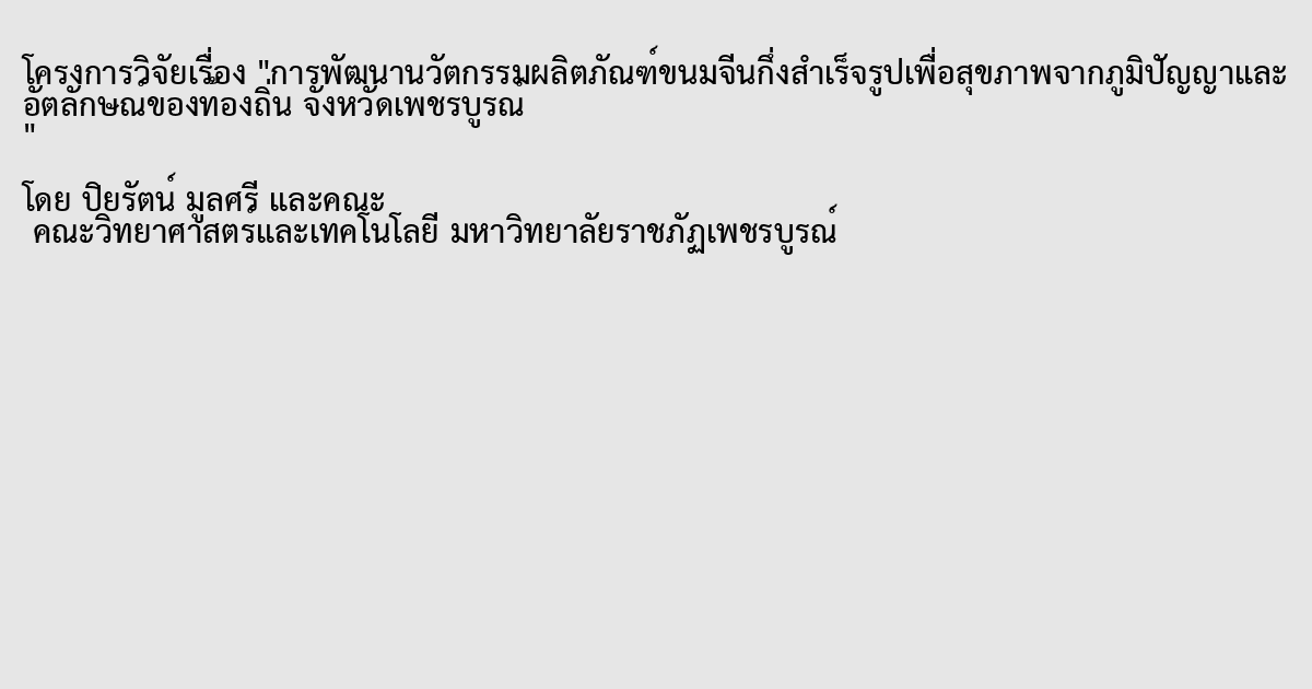 งานวิจันนี้ได้ศึกษาการเตรียมผลิตภัณฑ์ขนมจีนกึ่งสำเร็จรูปเพื่อสุขภาพจากภูมิปัญญาท้องถิ่นและอัตลักษณ์ของจังหวัดเพชรบูรณ์ จากการศึกษาพบว่าสูตรการเตรียมเส้นขนมจีนอบแห้งที่เหมาะสมคือ ใช้ส่วนผสมแป้งกับแป้งมัน 5% สูตรที่ส่วนผสมแป้งกับแป้งมัน 5% และแซนแทนกัม 1% และการใช้สีจากสมุนไพรธรรมชาติผสมลงไปจะช่วยทำให้ได้เส้นขนมจีนที่มีสีสันสวยงาม การทำให้เป็นเส้นแห้งโดยการอบลมร้อนที่อุณหภูมิ 80 °C เส้นขนมจีนอบแห้งที่ได้มีปริมาณคาร์โบไฮเดรตร้อยละ 86.4-88.2 ปริมาณโปรตีนร้อยละ 2.1-2.7 ปริมาณไขมันร้อยละ 0.8-1.1 ปริมาณเถ้าร้อยละ 0.6-0.9 ปริมาณกากเส้นใยร้อยละ 1.2-1.4 และมีปริมาณความชื้นอยู่ประมาณร้อยละ 6.4-8.1 ตามลำดับ สำหรับสูตรของน้ำยาขนมจีนอบแห้งสูตรพื้นฐานเตรียมได้จากส่วนผสมของเนื้อปลา 53% หอมแดง 8% กระเทียม 8% พริก 4% กระชาย 8% ข่า 7% ตระไคร้ 8% มะกรูด 2% และกะปิ 2% โดยผงน้ำยาขนมจีนที่ได้มีปริมาณคาร์โบไฮเดรตร้อยละ 50.8-54.4 ปริมาณโปรตีนร้อยละ 10.0-13.4 ปริมาณไขมันร้อยละ 20.3-24.2 ปริมาณกากใยร้อยละ 2.6-6.8 ปริมาณเถ้าร้อยละ 4.3-4.9 และมีปริมาณความชื้นละ 3.3-4.3 ตามลำดับ และมีคุณภาพอื่น ๆ ตามมาตรฐานผลิตภัณฑ์ชุมชนที่กำหนดไว้