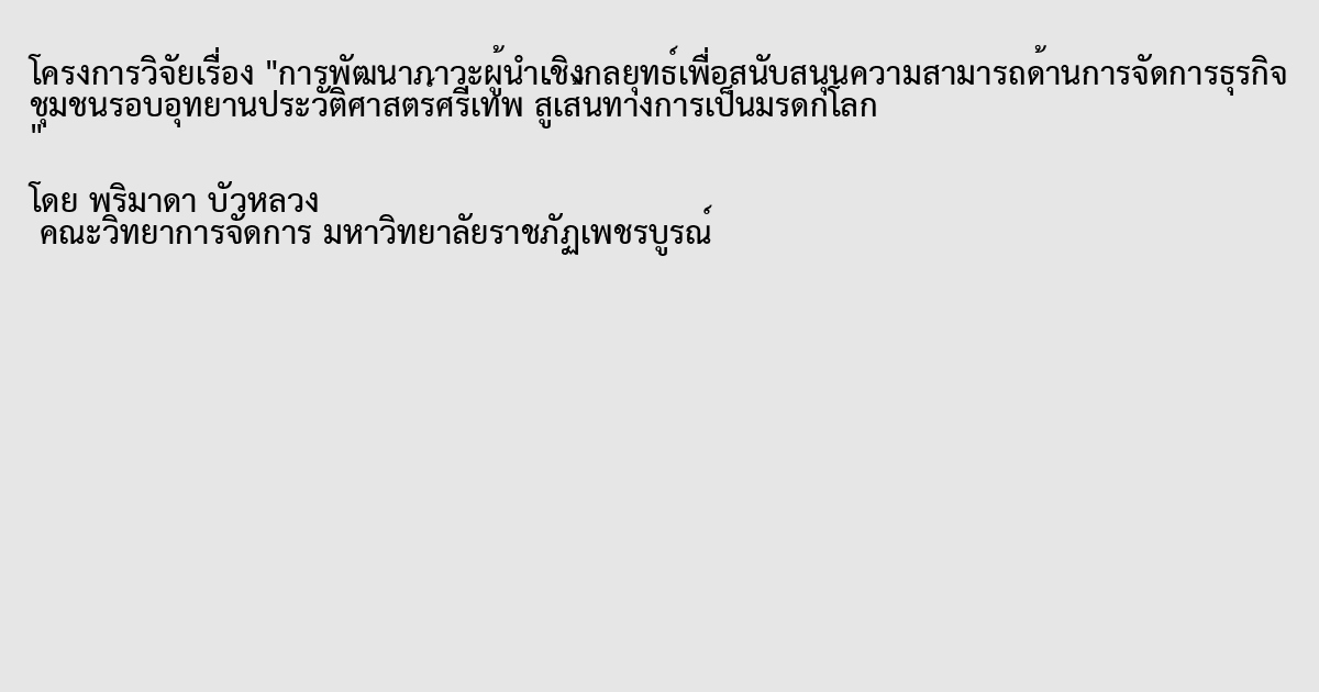 งานวิจัยนี้นำเสนอการพัฒนาภาวะผู้นำเชิงกลยุทธ์เพื่อสนับสนุนความสามารถด้านการจัดการธุรกิจชุมชนรอบอุทยานประวัติศาสตร์ศรีเทพ สู่เส้นทางการเป็นมรดกโลก โดยมีวัตถุประสงค์ 3ประการได้แก่ 1) เพื่อประเมินศักยภาพภาวะผู้นำเชิงกลยุทธ์อันสนับสนุนความสามารถการจัดการธุรกิจชุมชนรอบอุทยานประวัติศาสตร์ศรีเทพ สู่เส้นทางการเป็นมรดกโลก 2) เพื่อพัฒนารูปแบบพัฒนาภาวะผู้นำเชิงกลยุทธ์อันสนับสนุนความสามารถการจัดการธุรกิจชุมชนรอบอุทยานประวัติศาสตร์ศรีเทพ สู่เส้นทางการเป็นมรดกโลก 3) เพื่อประเมินรูปแบบพัฒนาภาวะผู้นำเชิงกลยุทธ์อันสนับสนุนความสามารถการจัดการธุรกิจชุมชนรอบอุทยานประวัติศาสตร์ศรีเทพ สู่เส้นทางการเป็นมรดกโลก