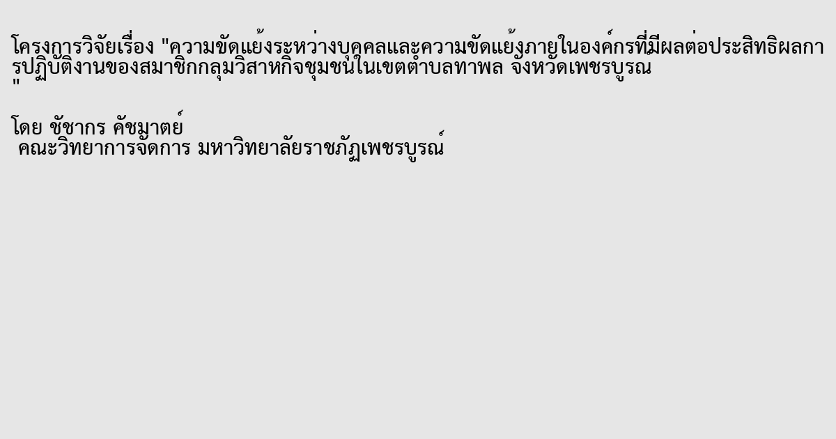 ความขัดแย้งระหว่างบุคคลและความขัดแย้งภายในองค์กรที่มีผลต่อประสิทธิผลการปฏิบัติงานของสมาชิกกลุ่มวิสาหกิจชุมชนในเขตตำบลท่าพล จังหวัดเพชรบูรณ์