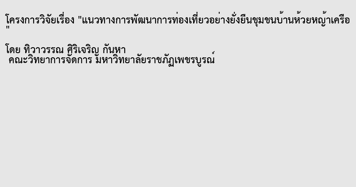 งานวิจัยนี้มีวัตถุประสงค์ (1) เพื่อศึกษาบริบทด้านการท่องเที่ยวชุมชนบ้านห้วยหญ้าเครือ อำเภอน้ำหนาว จังหวัดเพชรบูรณ์ (2) เพื่อศึกษาการมีส่วนร่วมด้านการท่องเที่ยวของคนในชุมชนบ้านห้วยหญ้าเครือ และ(3) เพื่อหาแนวทางการพัฒนาการท่องเที่ยวอย่างยั่งยืนชุมชนบ้านห้วยหญ้าเครือ โดยใช้ระเบียบวิธีวิจัยเชิงคุณภาพ (Qualitative Research) โดยการศึกษาข้อมูลด้านเอกสาร การสังเกต และการสัมภาษณ์แบบเจาะลึก โดยมีกลุ่มผู้ให้ข้อมูลหลักในการเก็บข้อมูล คือ หน่วยงานภาครัฐ ผู้นำชุมชนและผู้นำกลุ่มท่องเที่ยว คนในชุมชนบ้านห้วยหญ้าเครือ ผู้ประกอบการในพื้นที่อำเภอน้ำหนาว และนักท่องเที่ยว