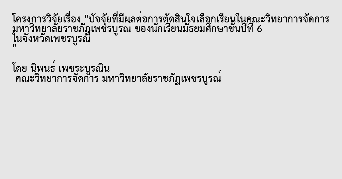 ปัจจัุยที่มีผลต่อการตัดสินใจเลือกเรียนในคณะวิทยาการจัดการ มหาวิทยาลัยราชภัฏเพชรบูรณ์ ของนักเรียนมัธยมศึกษาชั้นปีที่ 6 ในจังหวัดเพชรบูรณ์
