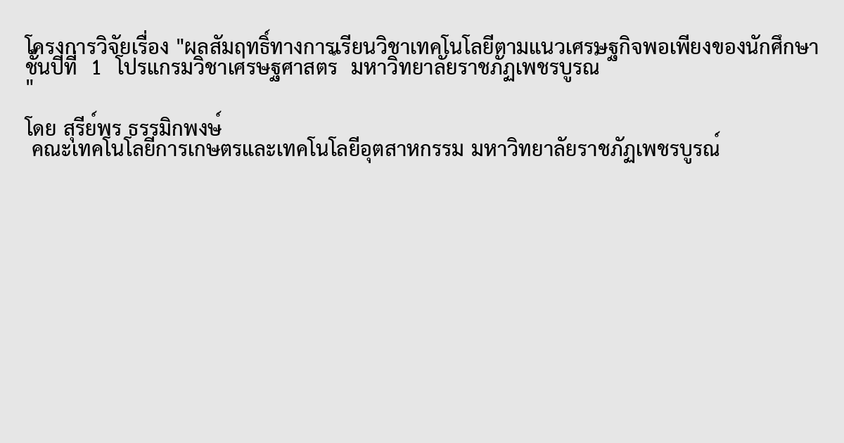ผลสัมฤทธิ์ทางการเรียนวิชาเทคโนโลยีตามแนวเศรษฐกิจพอเพียงของนักศึกษา ชั้นปีที่ 1 โปรแกรมวิชาเศรษฐศาสตร์ มหาวิทยาลัยราชภัฏเพชรบูรณ์
