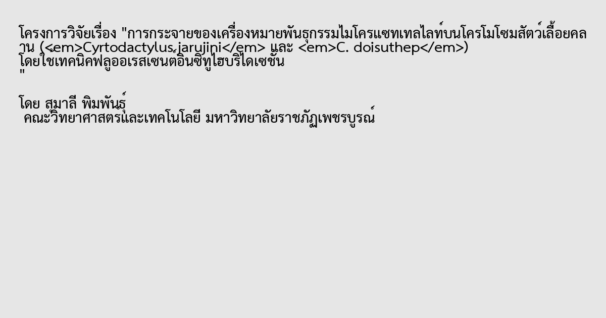 การศึกษาการกระจายของลำดับเบสไมโครแซทเทลไลท์บนโครโมโซมของตุ๊กแกป่าโดยใช้เทคนิค Fluorescence in situ Hybridization (FISH) ใช้โพรบไมโครเซทเทลไลท์ 4 ประเภท เป็นเครื่องหมายทางพันธุกรรม ได้แก่ mono-, di-, tri- และ oligonucleotides หลายชนิด ได้แก่ A20 TA15 CGG10 GAA10 และ telomeres ที่มีลำดับเบส TTAGGGn ตามลำดับ พบว่ามีรูปแบบการกระจายของดีเอ็นเอไมโครแซทเทลไลท์ที่แตกต่างกัน ตามแต่ละชนิดของโพรบ แต่ละโพรบปรากฏสัญญาณ และมีรูปแบบการกระจายของไมโครแซทเทลไลท์ดีเอ็นเอที่หลากหลาย ทั้งในรูปแบบที่มีการสะสมมากบริเวณเซนโตรเมียร์และเทโลเมียร์ กระจายทั่วทั้งจีโนม หรือสะสมมากปรากฏเป็นจุดหนาแน่นในโครโมโซมบางแท่ง ความสัมพันธ์และวิวัฒนาการของโครโมโซมของตุ๊กแกป่า 2 ชนิด ในการศึกษาครั้งนี้ยังไม่ชัดเจน อย่างไรก็ตามจากสัญญาณโพรบบางชนิดแสดงให้เห็นถึงบริเวณที่มีลำดับเบสซ้ำสะสมมากที่มีความเชื่อมโยงกันระหว่างโครโมโซมของตุ๊กแกป่าทั้ง 2 ชนิด ซึ่งจำเป็นจะต้องมีการศึกษาเพื่อยืนยันสมมติฐานดังกล่าวในการศึกษาครั้งต่อไปในอนาคต