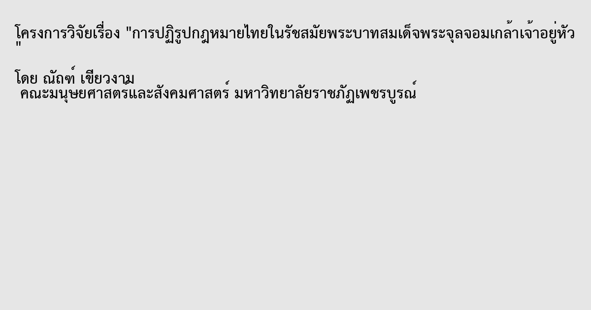 งานวิจัยนี้มีวัตถุประสงค์ 3 ประการ คือ (1) เพื่อศึกษาถึงสาเหตุและปัจจัยที่ทำให้เกิดการปฏิรูปกฎหมายของไทยในรัชสมัยพระบาทสมเด็จพระจุลจอมเกล้าเจ้าอยู่หัว (2) เพื่อศึกษาถึงขั้นตอนและวิธีดำเนินการปฏิรูปกฎหมายของไทยในรัชสมัยพระบาทสมเด็จพระจุลจอมเกล้าเจ้าอยู่หัว และ (3) เพื่อศึกษาถึงผลสำเร็จและอุปสรรคของการปฏิรูปกฎหมายไทยในรัชสมัยพระบาทสมเด็จพระจุลจอมเกล้าเจ้าอยู่หัว การวิจัยครั้งนี้เป็นการวิจัยเชิงคุณภาพโดยใช้วิธีการวิเคราะห์เชิงประวัติศาสตร์อันเป็นการศึกษาข้อมูลจากเอกสารต่าง ๆ ที่เกี่ยวข้องทั้งหนังสือบทความงานวิจัยวิทยานิพนธ์และงานวิชาการต่าง ๆ