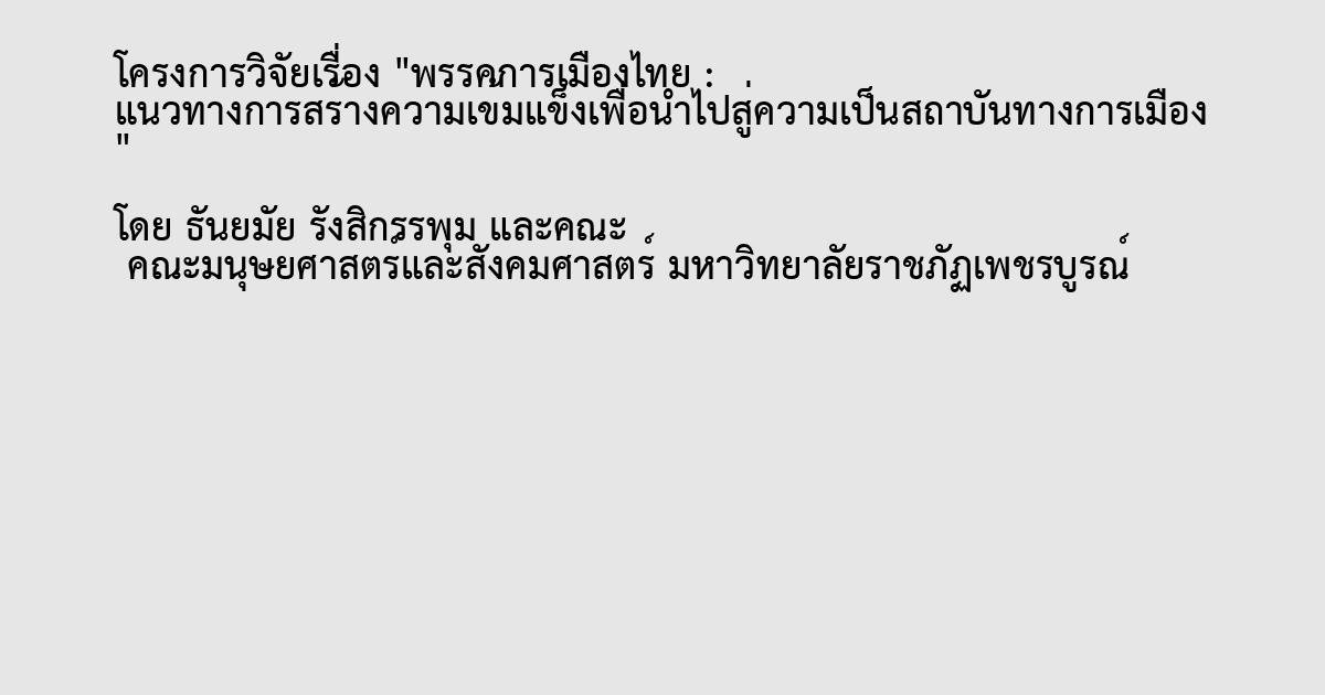 การวิจัยนี้มีวัตถุประสงค์ 3 ประการ คือ (1) เพื่อศึกษาพัฒนาการและปัญหาของพรรค การเมืองไทย (2) เพื่อศึกษาแนวทางการพัฒนาพรรคการเมืองไทยไปสู่ความเป็นสถาบันทางการเมือง และ (3) เพื่อศึกษาแนวทางการสร้างความเข้มแข็งให้พรรคการเมืองไทย การวิจัยนี้เป็นการวิจัยเชิงคุณภาพ โดยการศึกษาข้อมูลจากเอกสารต่าง ๆ เช่น ตำรา บทความ หนังสือ และงานวิจัยที่เกี่ยวข้อง แล้ววิเคราะห์เชิงตรรกะและการวิพากษ์
