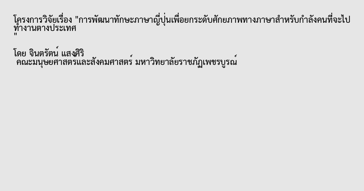 งานวิจัยชิ้นนี้เป็นงานวิจัย มีจุดมุ่งหมายเพื่อพัฒนาทักษะภาษาญี่ปุ่นเพื่อการสื่อสาร และเพื่อยกระดับศักยภาพทางภาษาสำหรับกาลังคนที่จะไปทางานต่างประเทศในจังหวัดเพชรบูรณ์ จำนวน 15 คน เครื่องมือที่ใช้ในการวิจัย ได้แก่ แบบทดสอบก่อนเรียน มี 1 ชุด ใช้ทดสอบก่อนเรียนและหลังเรียน คือ Paper test เป็นข้อสอบแบบปรนัย จำนวน 30 ข้อ และแบบสอบถามความสนใจของกาลังคนที่จะไปทางานต่างประเทศในจังหวัดเพชรบูรณ์