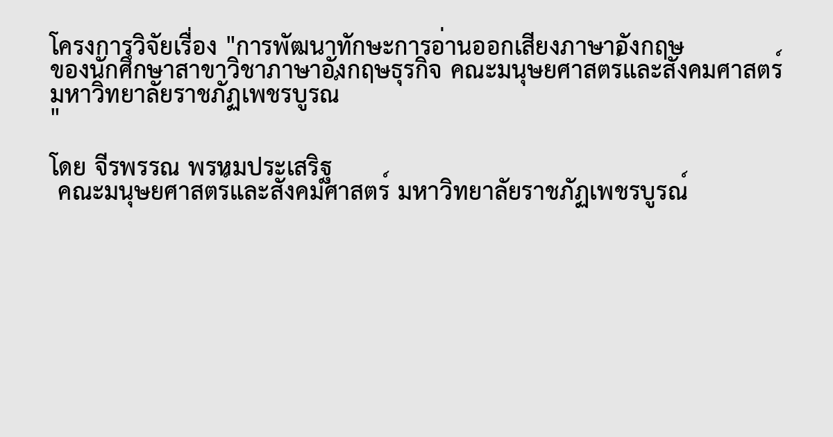การพัฒนาทักษะการอ่านออกเสียงภาษาอังกฤษ ของนักศึกษาสาขาวิชาภาษาอังกฤษธุรกิจ คณะมนุษยศาสตร์และสังคมศาสตร์ มหาวิทยาลัยราชภัฏเพชรบูรณ์