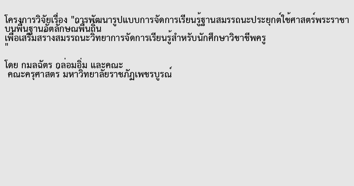 การพัฒนา,รูปแบบการจัดการเรียนรู้ฐานสมรรถนะ,ประยุกต์ใช้,ศาสตร์พระราชา,สมรรถนะวิทยาการจัดการเรียนรู้,พื้นฐานอัตลักษณ์พื้นถิ่น,Development,Competency-based Learning Management,Application,the King Rama IX's Philosophy,Competency of Learning Management,Fundamentals of Local Identity