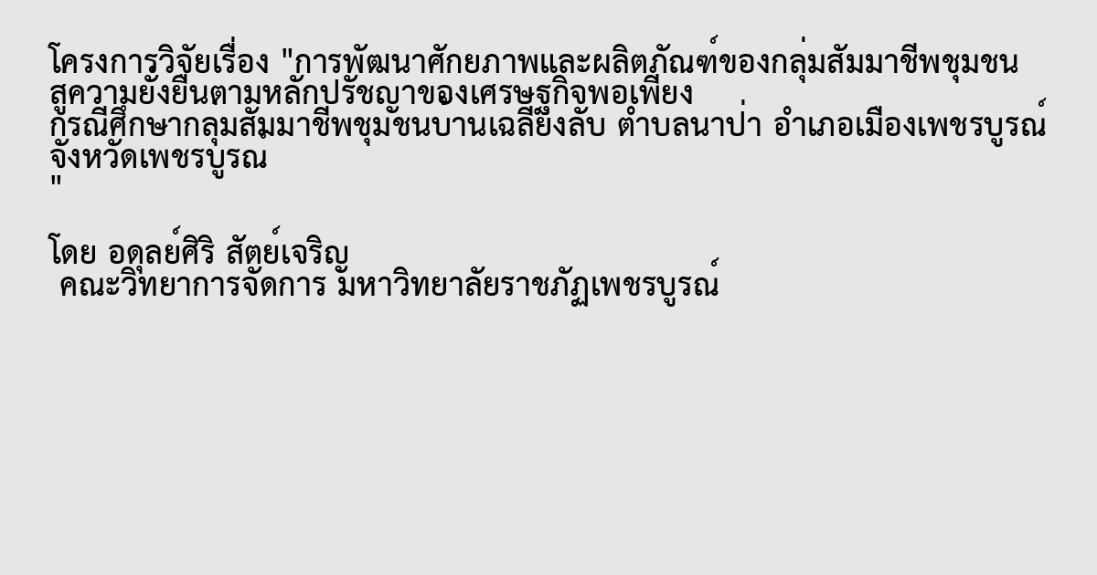 การพัฒนาศักยภาพและผลิตภัณฑ์ของกลุ่มสัมมาชีพชุมชน สู่ความยั่งยืนตามหลักปรัชญาของเศรษฐกิจพอเพียง กรณีศึกษากลุ่มสัมมาชีพชุมชนบ้านเฉลียงลับ ตำบลนาป่า อำเภอเมืองเพชรบูรณ์ จังหวัดเพชรบูรณ์